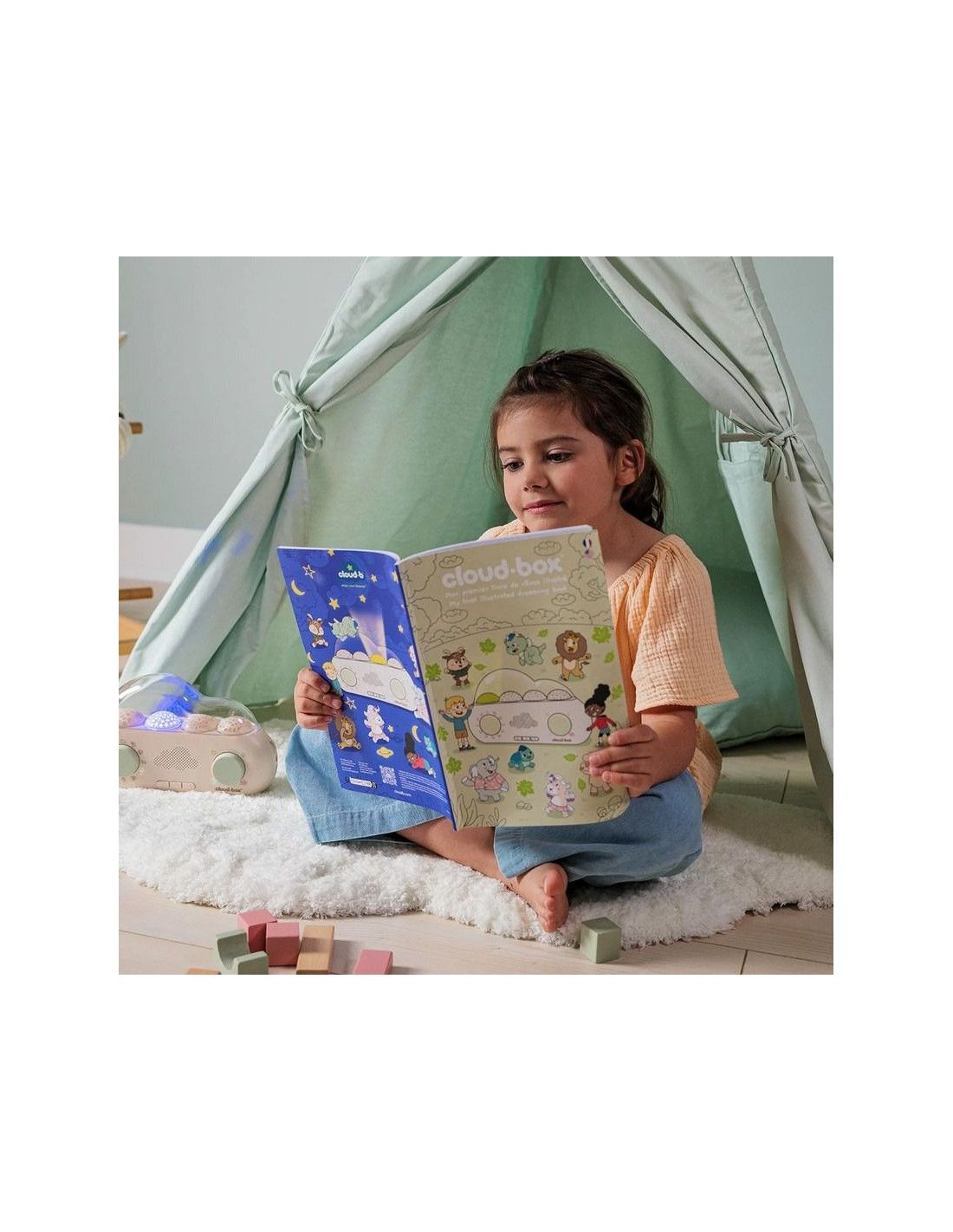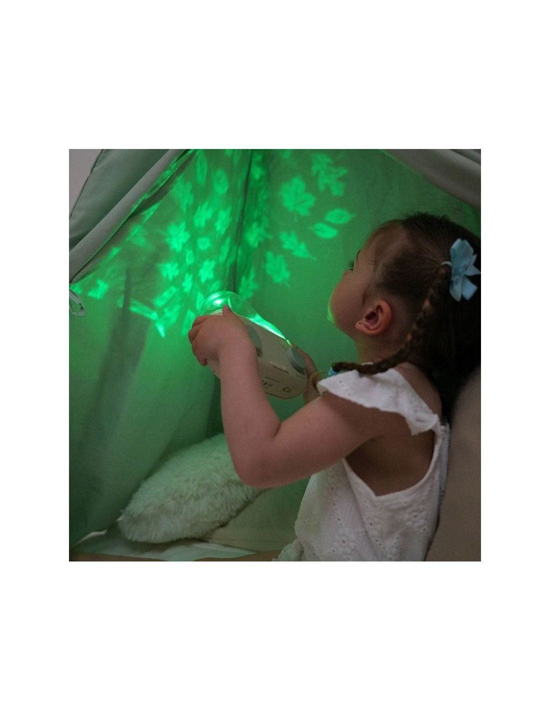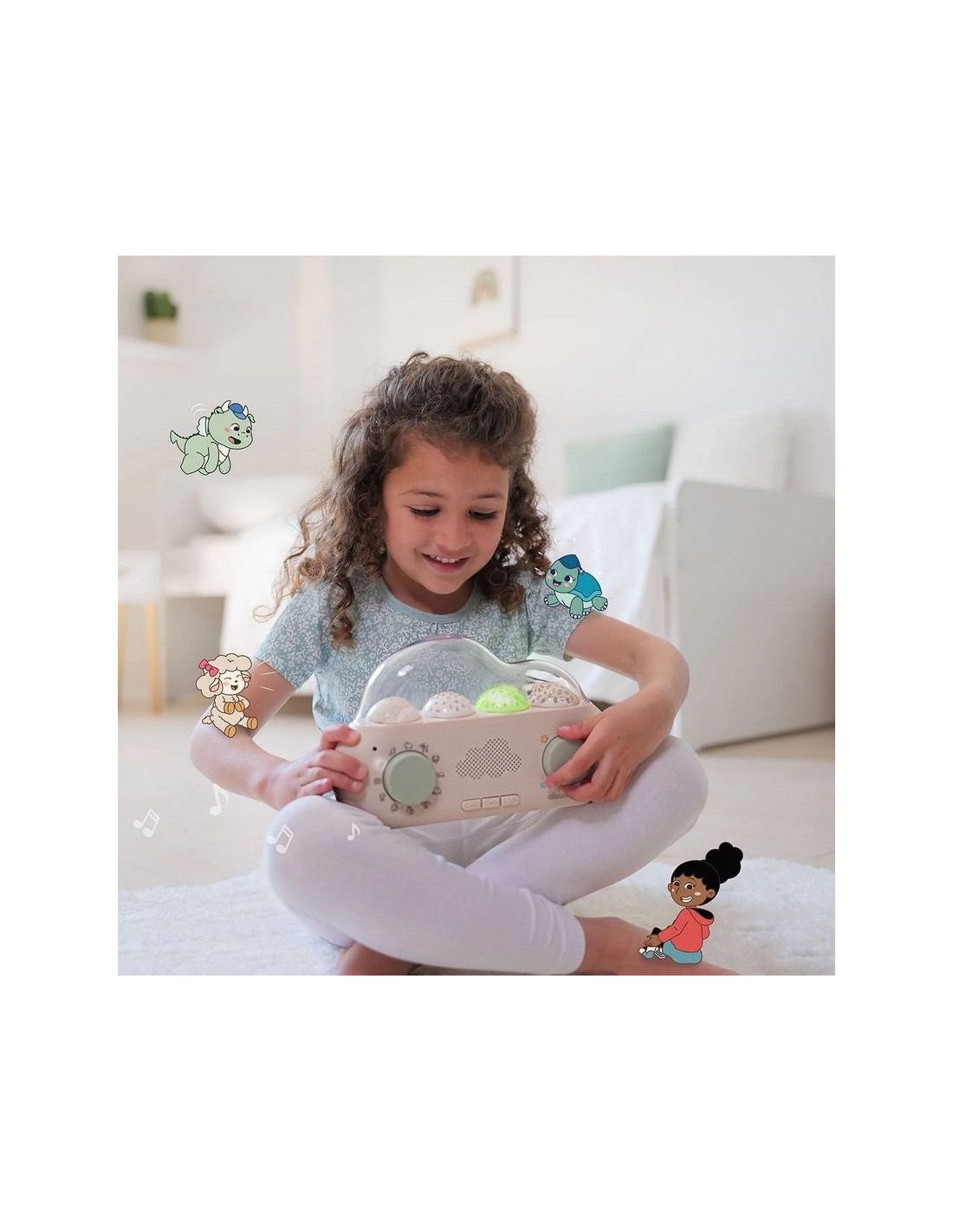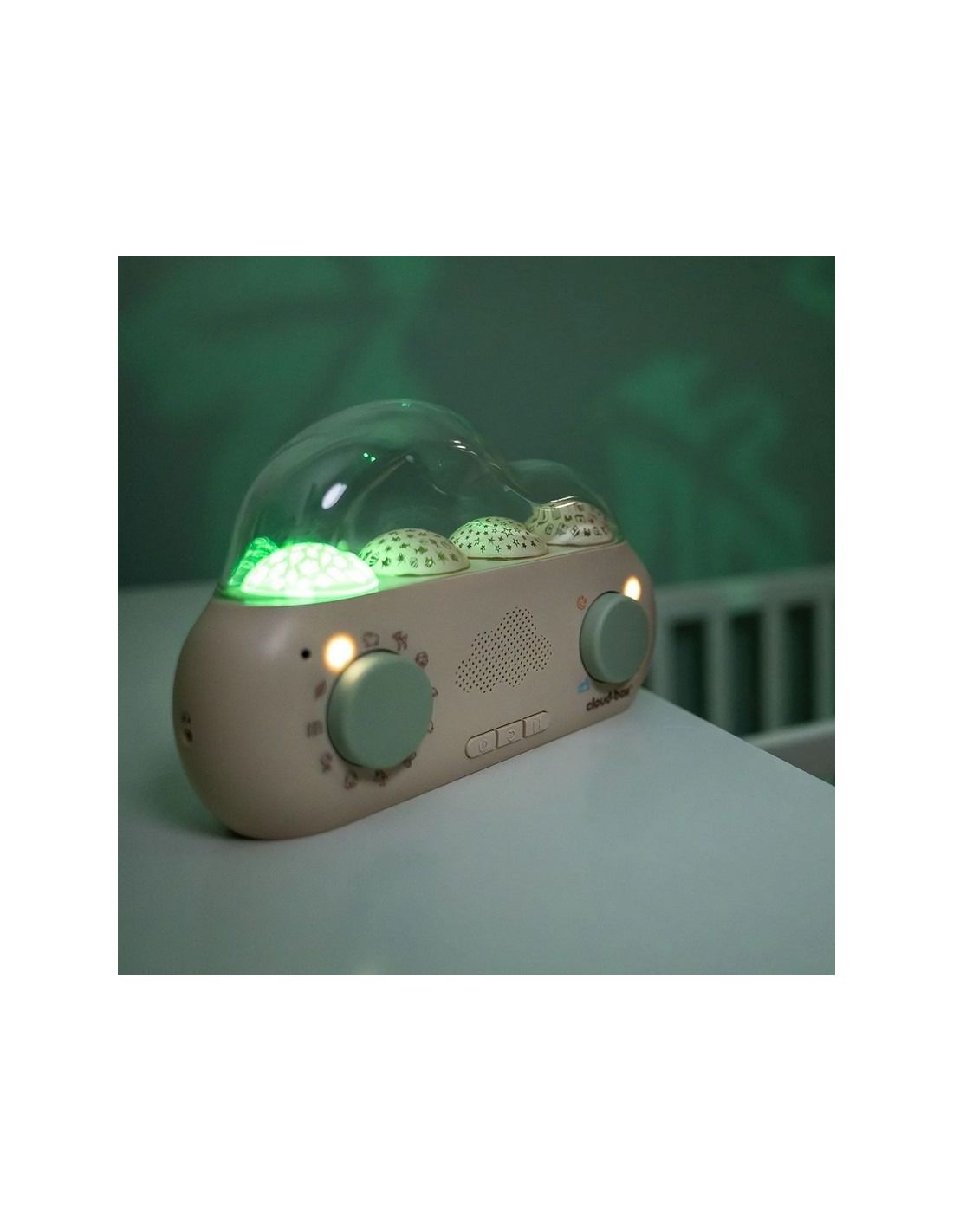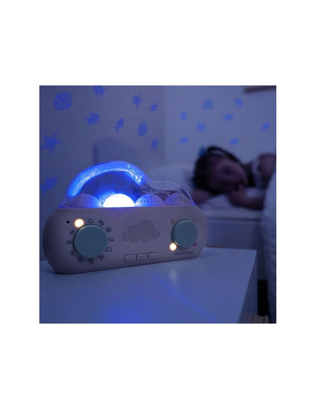 - CloudBox to nie tylko opowieści! Wyświetla uspokajające projekcje świetlne, które tworzą idealne warunki do relaksu i zasypiania. Wybierz między różnymi efektami świetlnymi, które dostosowują się do nastroju i wieku dziecka.