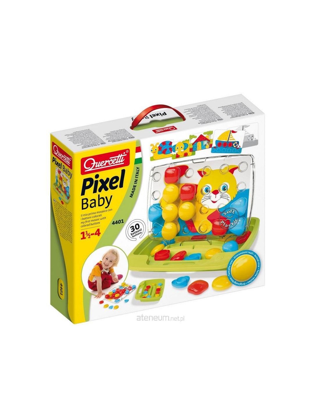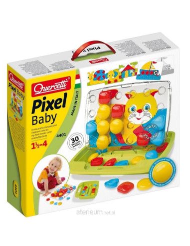 QUERCETTI MOZAIKA PIXEL BABY sprawia, że tworzenie mozaiki poprzez wstawianie kołeczków w perforowaną tablicę zgodnie z proponowanym wzorem bądź własną wyobraźnią jest wspaniałą i twórczą zabawą. Zabawka stymuluje rozpoznawanie kolorów, rozwija umiejętności manualne oraz koordynację ruchową. Wszystkie elementy wykonane są z tworzywa wysokiej jakości, są elastyczne i mają bezpieczne, zaokrąglone brzegi. Zestaw składa się z kołeczków o średnicy -46mm, 8 kartonowych kart wzorów oraz walizeczki, która po rozłożeniu staje się podstawką i tabliczką. Zabawka została wyprodukowana we Włoszech.