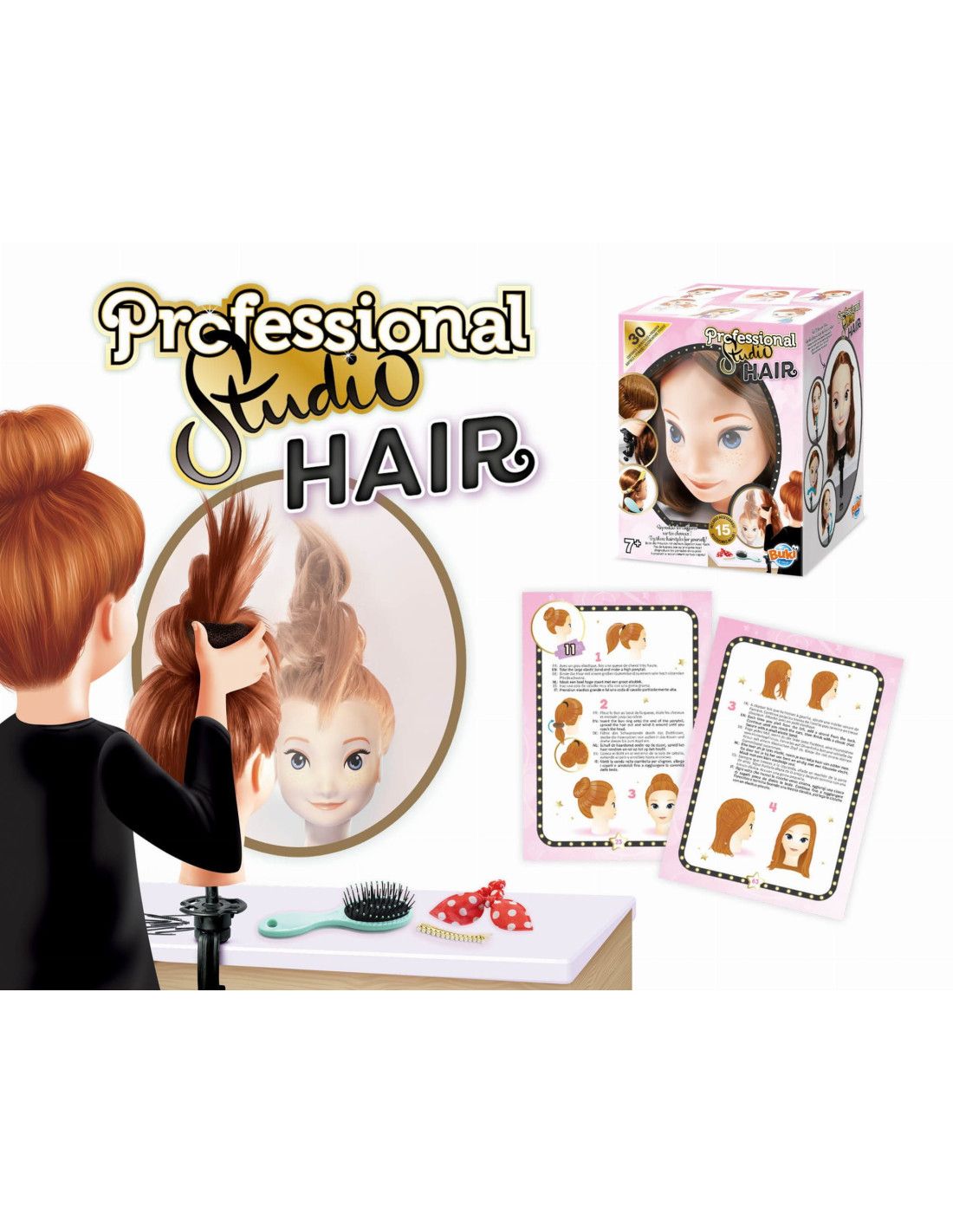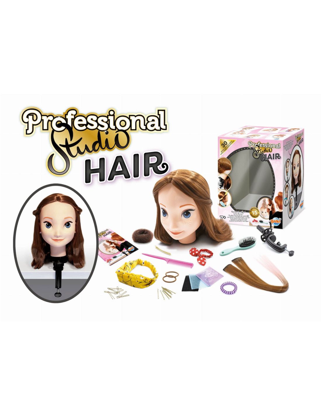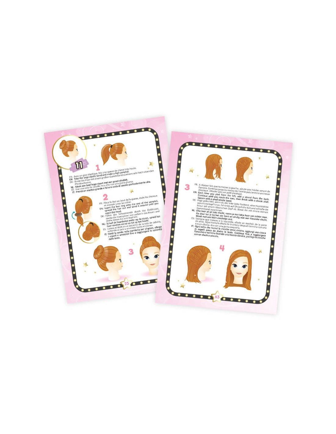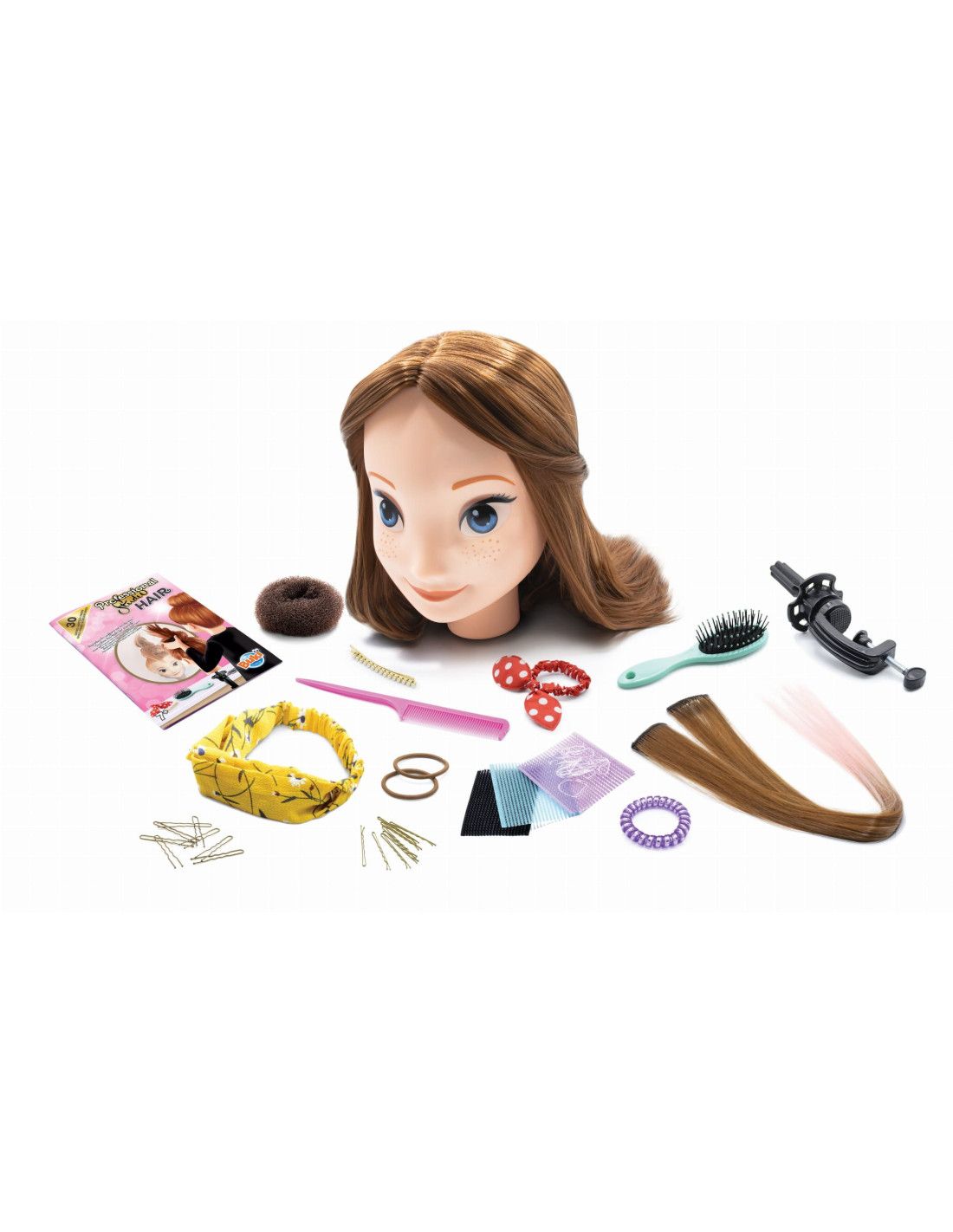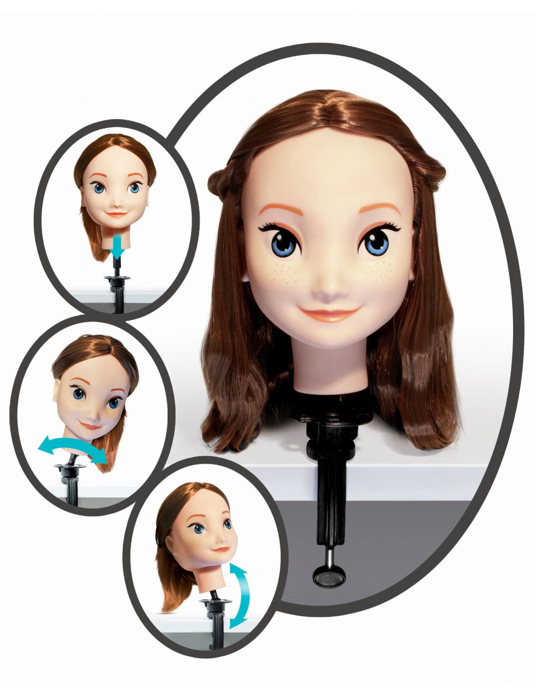 Głowa fryzjerska do ćwiczenia różnych stylizacji, z bardzo realistycznym wzorem wzrostu włosów. Główkę mocuje się do blatu uchwytem, aby nie poruszała się w czasie zabawy. 30 różnych stylizacji fryzur do wypróbowania na główce lalki, a następnie na sobie lub przyjaciółce.