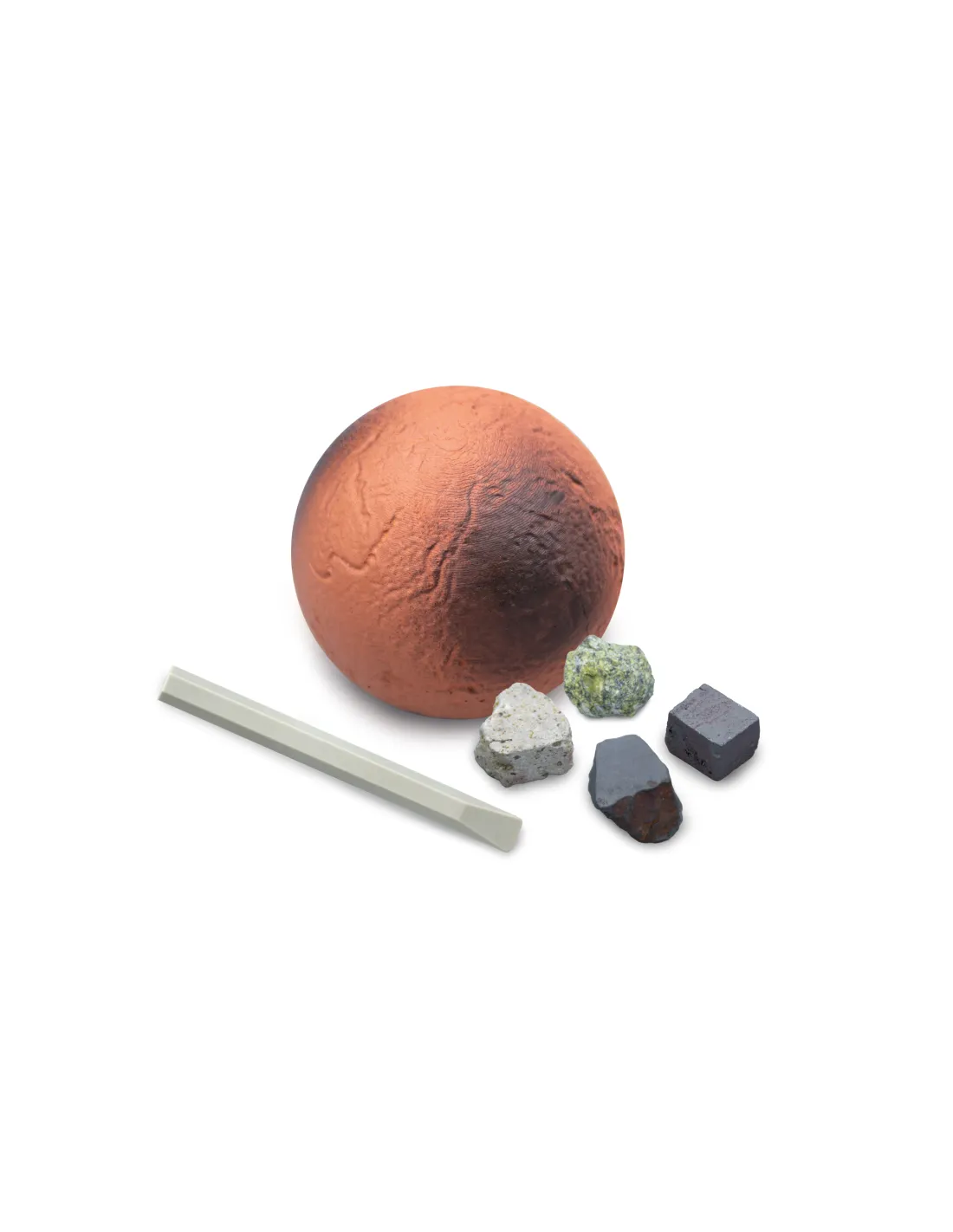 W zestawie znajduje się również blok gipsu w kształcie planety Mars, w którym ukryte są cztery prawdziwe skały: