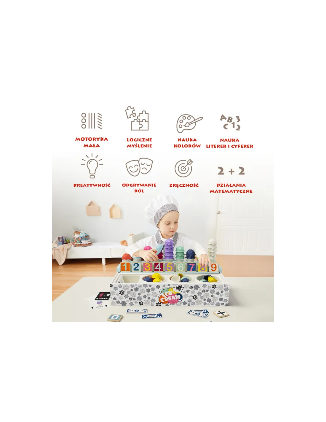 Ćwiczy motorykę małą i koordynację ręka-oko – układanie gałek lodów i posługiwanie się akcesoriami to świetny trening zręczności.