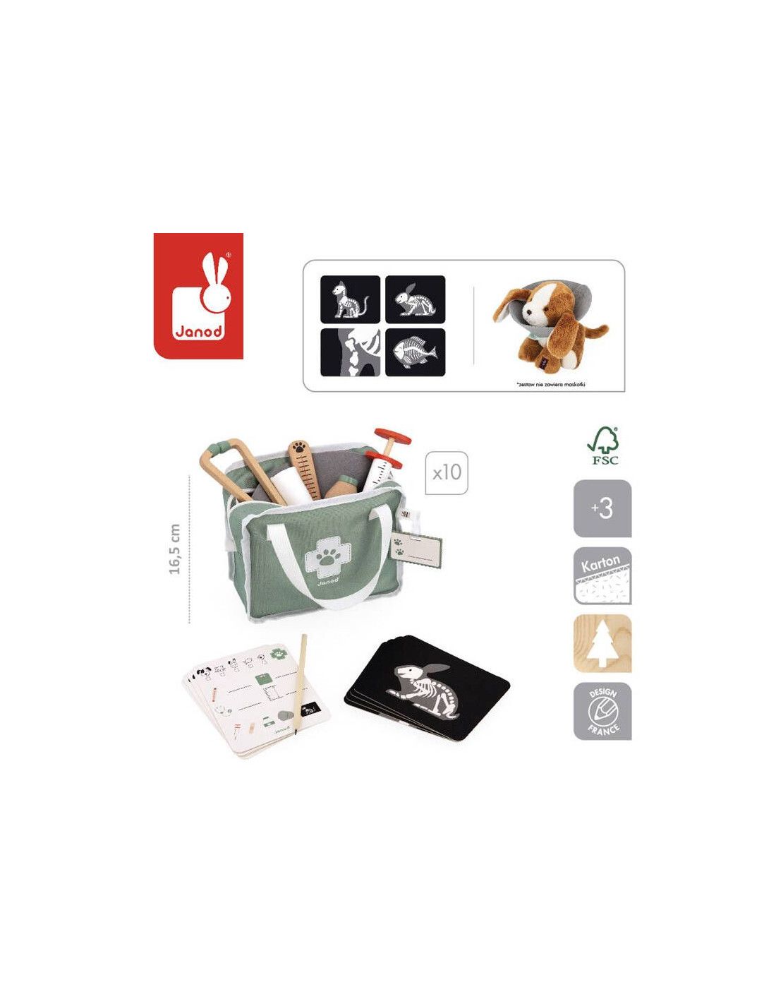 - Zawartość zestawu: W skład zestawu wchodzą: 1 strzykawka, 1 termometr, 1 bandaż, 1 stetoskop, 1 buteleczka z „lekarstwem”, 1 filcowy kołnierz, 4 recepty, 4 zdjęcia rentgenowskie, 1 wizytówka weterynarza do wypełnienia oraz 1 ołówek. Każdy element jest starannie wykonany z drewna lub solidnego kartonu, pomalowany bezpiecznymi dla dzieci farbami.