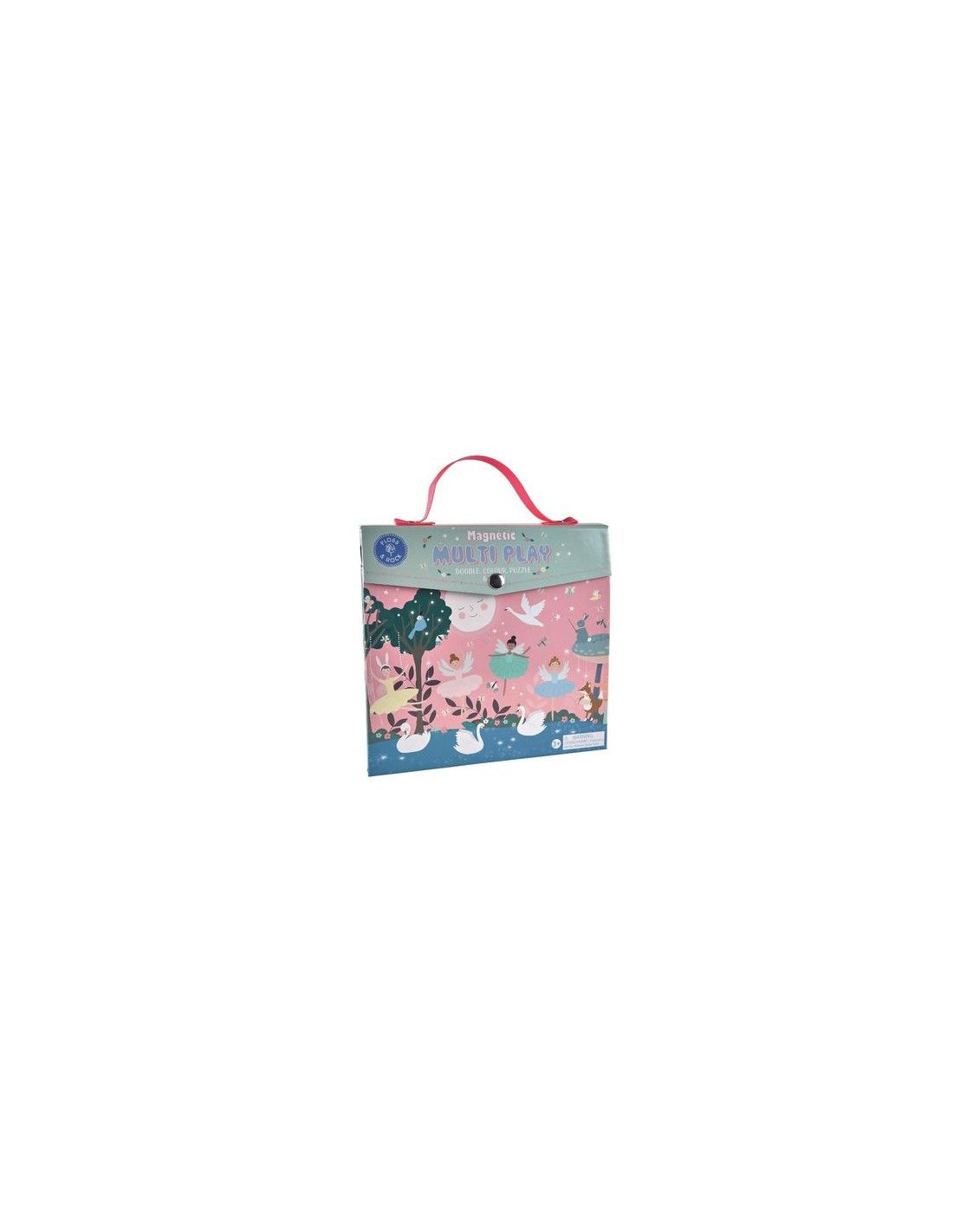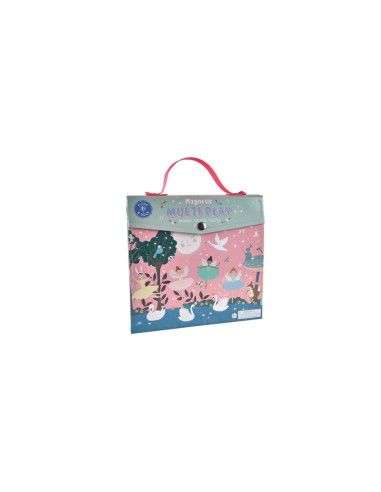 W środku znajdują się puzzle z 20 magnetycznymi elementami, tablica do rysowania, 4 kolorowe pisaki z gumkami do ścierania oraz magnetyczne figurki baletnic, tancerek, łabędzi i kolorowych ptaków. Kompaktowe pudełko z uchwytem idealnie sprawdza się w podróży oraz podczas zabawy w domu i na świeżym powietrzu.