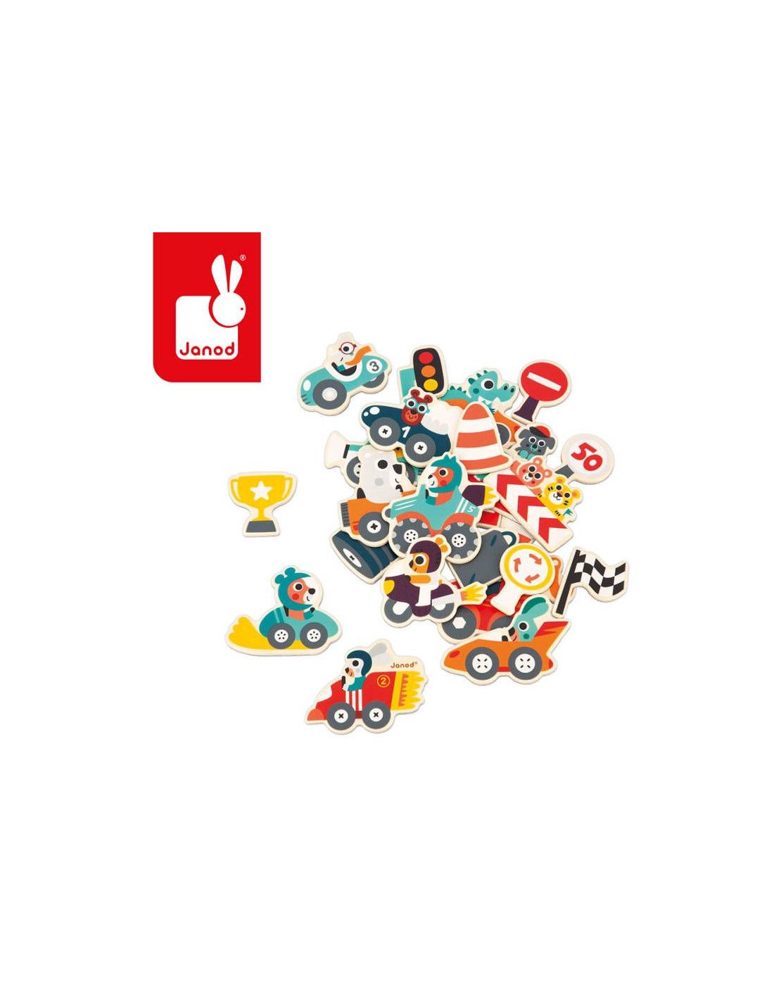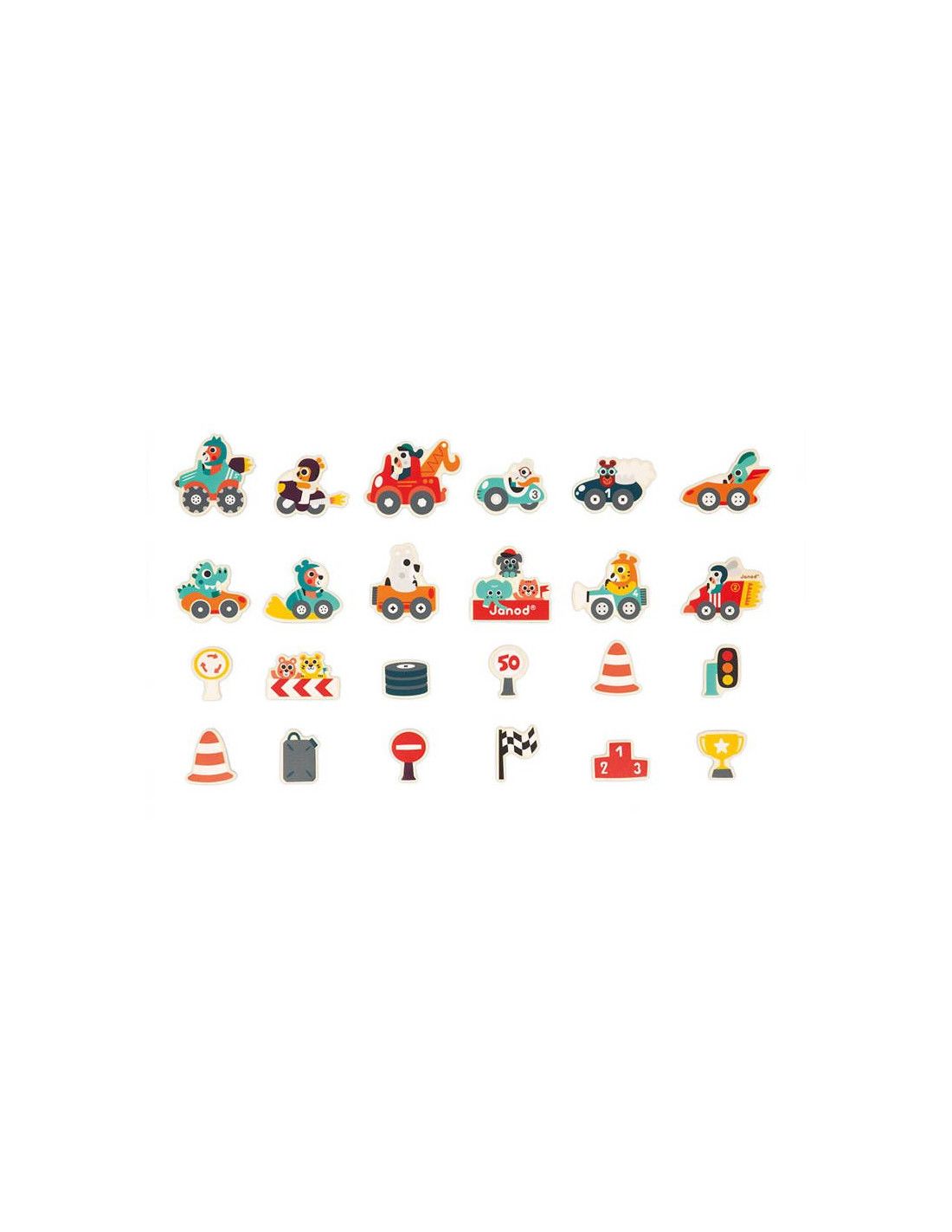 W skład zestawu wchodzi 24 magnesy o wielkości 5-7 cm, które nawiązują do tematyki wyścigów samochodowych. Znajdziesz tutaj bolidy prowadzone przez zwierzęta, holownik, podium, trofeum, opony, kanister, flagę, znaki drogowe, pachołki ostrzegawcze, sygnalizację świetlną oraz kibiców. Każdy z tych elementów wyróżnia się ciekawym designem oraz intensywnymi, energetyzującymi barwami.