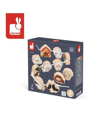 - Elementy zestawu: Zawiera dwa białe sznurki z laminowanymi końcówkami, na które dziecko może nawlekać drewniane elementy: 9 owieczek, 1 budynek farmy i 1 psa pasterskiego. Dziecko może tworzyć różne historie z życia na farmie, tworząc własne opowieści podczas zabawy.