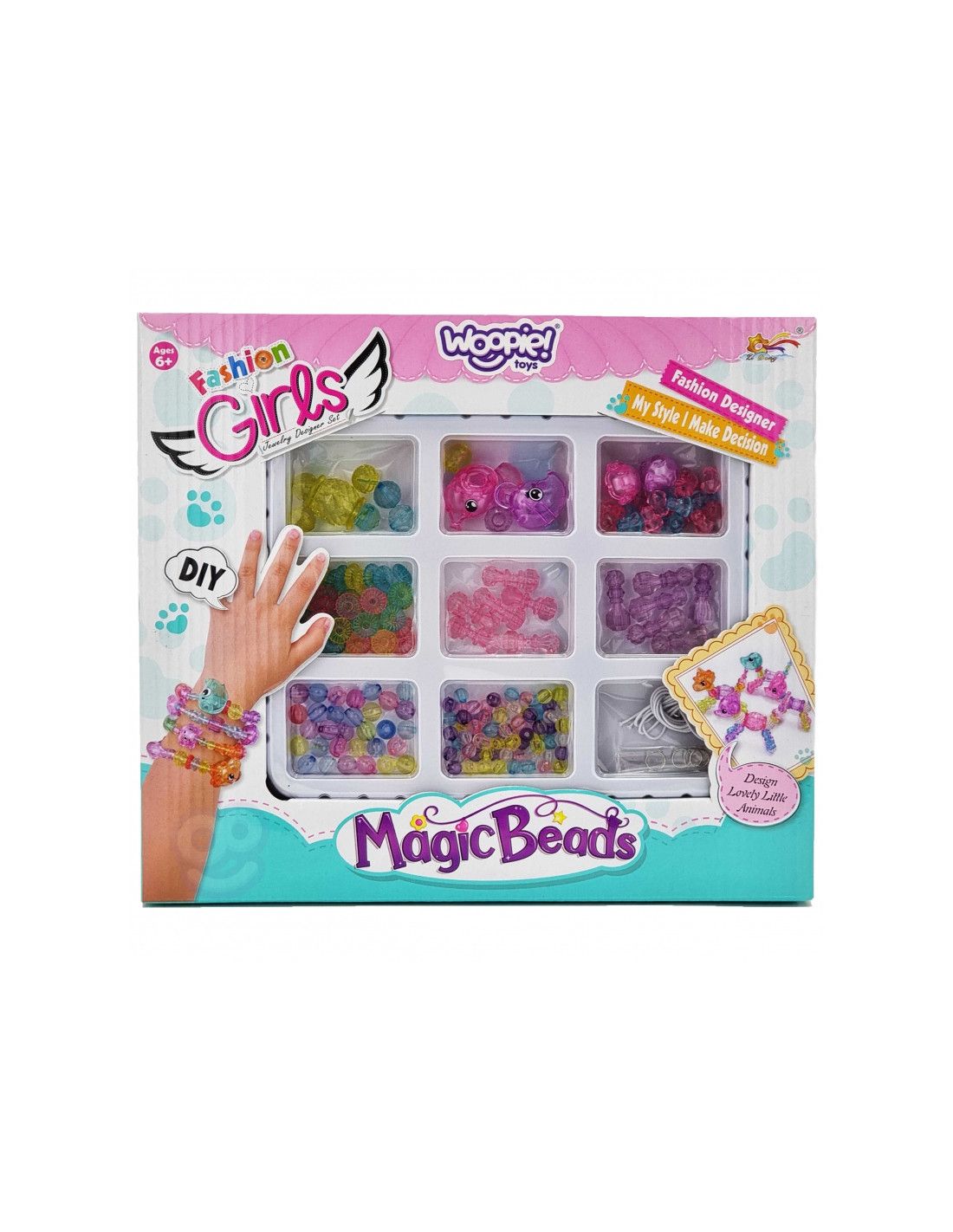 Zestaw do Robienia Biżuterii z motywem Zwierząt od marki WOOPIE jest stylowym, kreatywnym i zjawiskowym zestawem dla każdego dziecka. Dziecko samodzielnie może mieszać i dopasowywać różne koraliki oraz zawieszki, aby stworzyć swoją niepowtarzalną bransoletkę, pierścionek, kolczyki lub wisiorek. Wszystko można wykonac z motywem zwierząt. Dziecko może nosić bransoletkę samemu lub podarować komuś bliskiemu. Zestaw zawiera różnego rodzaju elementy: koraliki różnej wielkości, zawieszki, elementy przypominające zwierzątka, oraz żyłki. Komplet zapakowany jest w kolorowe pudełko z wygodnym uchwytem do przenoszenia idealne na prezent. Po rozpakowaniu zestaw jest łatwo przenośny jest lekki i poręczny, co sprawia, że dziecko z łatwością może go zabrać ze sobą do przedszkola, do kolegi, do ogrodu. Opakowanie, również posiada formę organizera, co pozwoli na bezpieczne przechowywanie małych elementów znajdujących się w zestawie. Zabawa w tworzenie biżuterii pozytywnie wpływa na rozwój dziecka, kształtuje jego zdolności plastyczne wraz z rozwojem wyobraźni oraz kreatywności, ćwicząc jednocześnie koncentrację; rozwija zdolności manualne/motoryczne tzw. "małą motorykę" (ruch rączek), a także przy zabawie z przyjaciółmi uczy współpracy, dzielenia się i usprawnia zdolności społeczno-integracyjne.