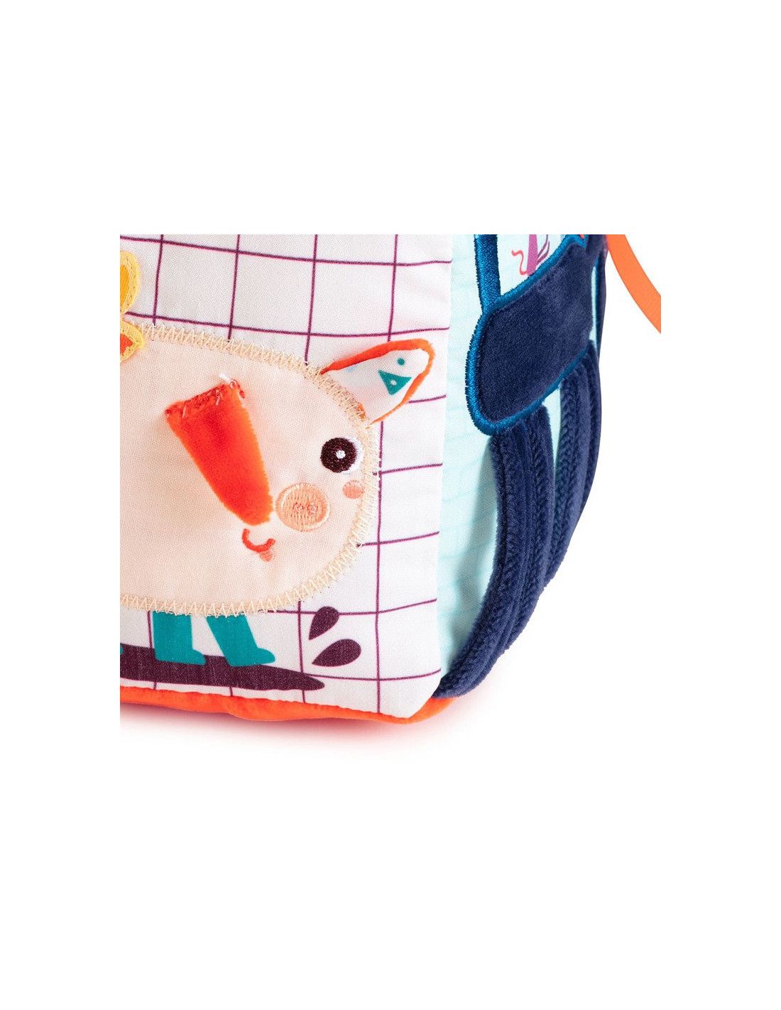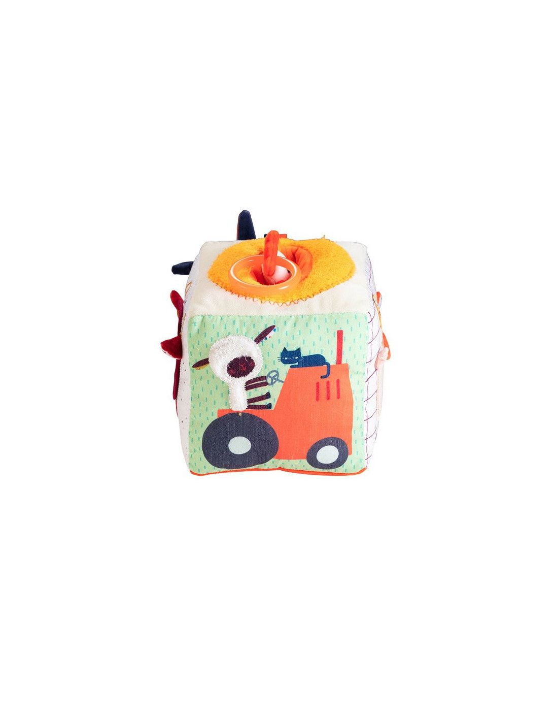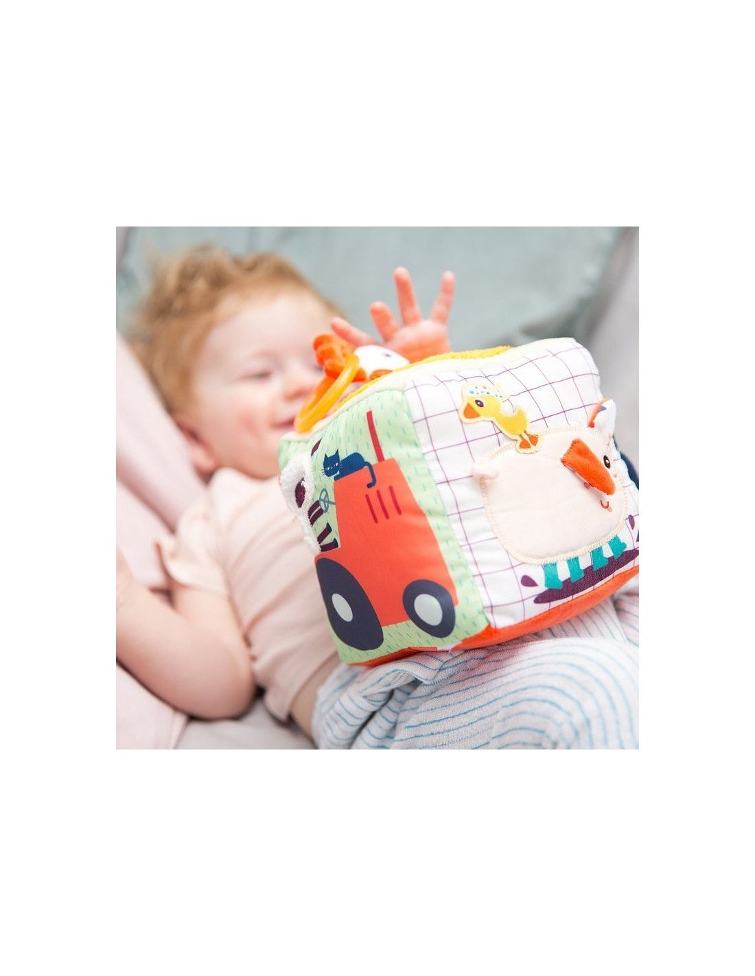 Dźwiękowa kostka aktywizująca Farma belgijskiej marki Lilliputiens to niebanalne, miękkie i wielofunkcyjne źródło rozrywki i nauki dla ciekawskich maluszków. Na każdym z jej boków znajduje się inna scenka z gospodarstwa i charakterystyczni dla marki bohaterowie: krówka Rosalie z lusterkiem, puchata owieczka Yvon kierująca traktorem, kaczor Gaston podróżujący na grzbiecie świnki Simona przez błotną kałużę, osiołek Ignace z bujną grzywą transportujący myszkę i zajączka i kokoszka Paulette chowająca się głęboko w swoim mięciutkim gnieździe. Kostka została uszyta z materiałów o różnych wzorach i fakturach, posiada wiele ukrytych funkcji, m. in. grzywa osiołka z tasiemek i aksamitne uszka zwierzątek do chwytania, obręcz-gryzak na elastycznym sznureczku, czy szeleszczący bok zabawki. Kostka przy potrząsaniu wydaje dźwięki – odgłosy różnych zwierząt hodowlanych, a zadaniem dziecka jest rozpoznać, do którego z bohaterów należy każdy z nich. Zabawka jest solidnie wykonana i w pełni bezpieczna. Zaskakuje i pobudza dziecięcą wyobraźnię. Rozwija koordynację ręka-oko i małą motorykę (chwytanie, ciągnięcie, potrząsanie, przesuwanie, wkładanie, wyciąganie), aktywizuje zmysł słuchu (odgłosy), wzroku i dotyku, a obręcz-gryzak – przynosi ulgę w trudnym okresie ząbkowania.