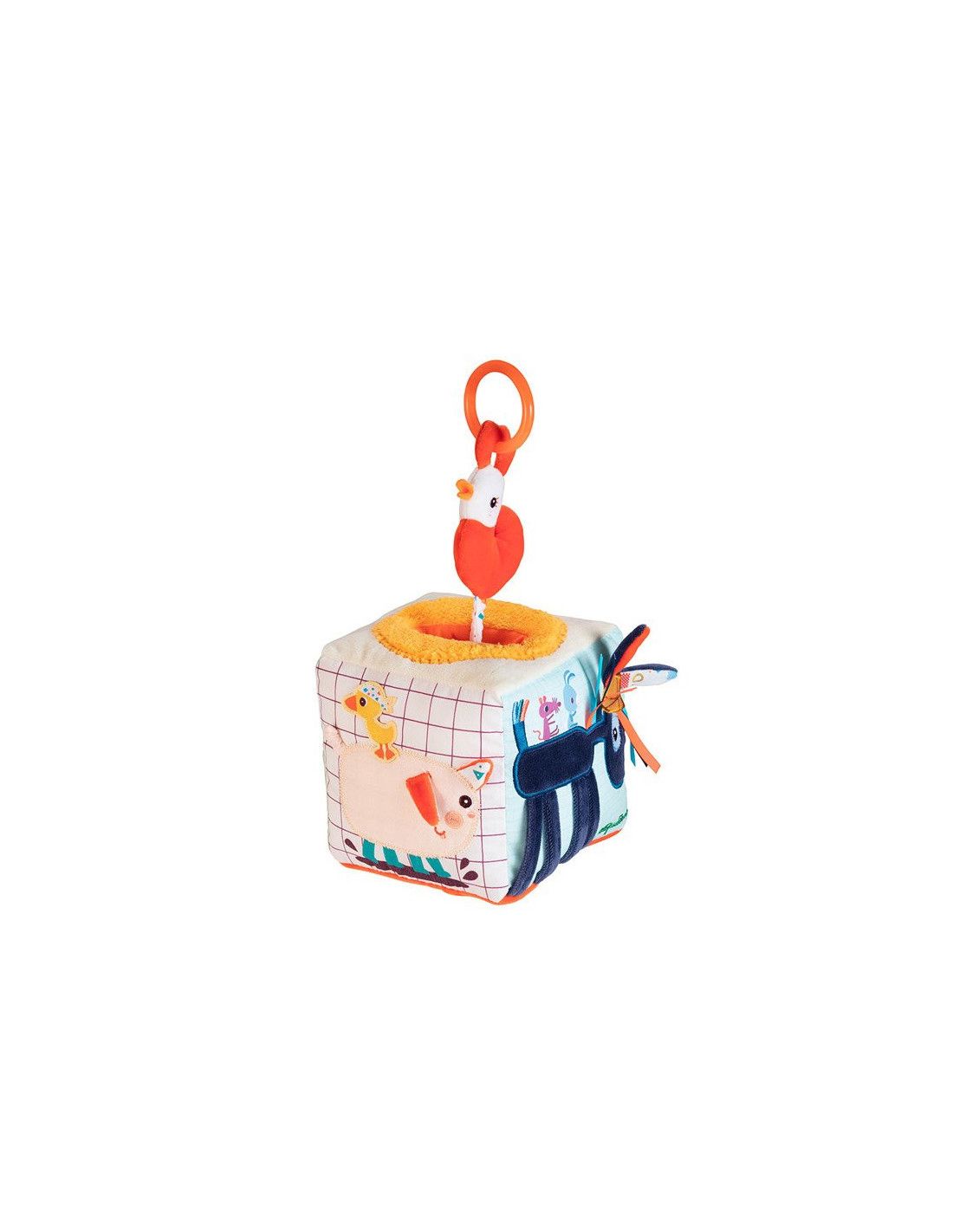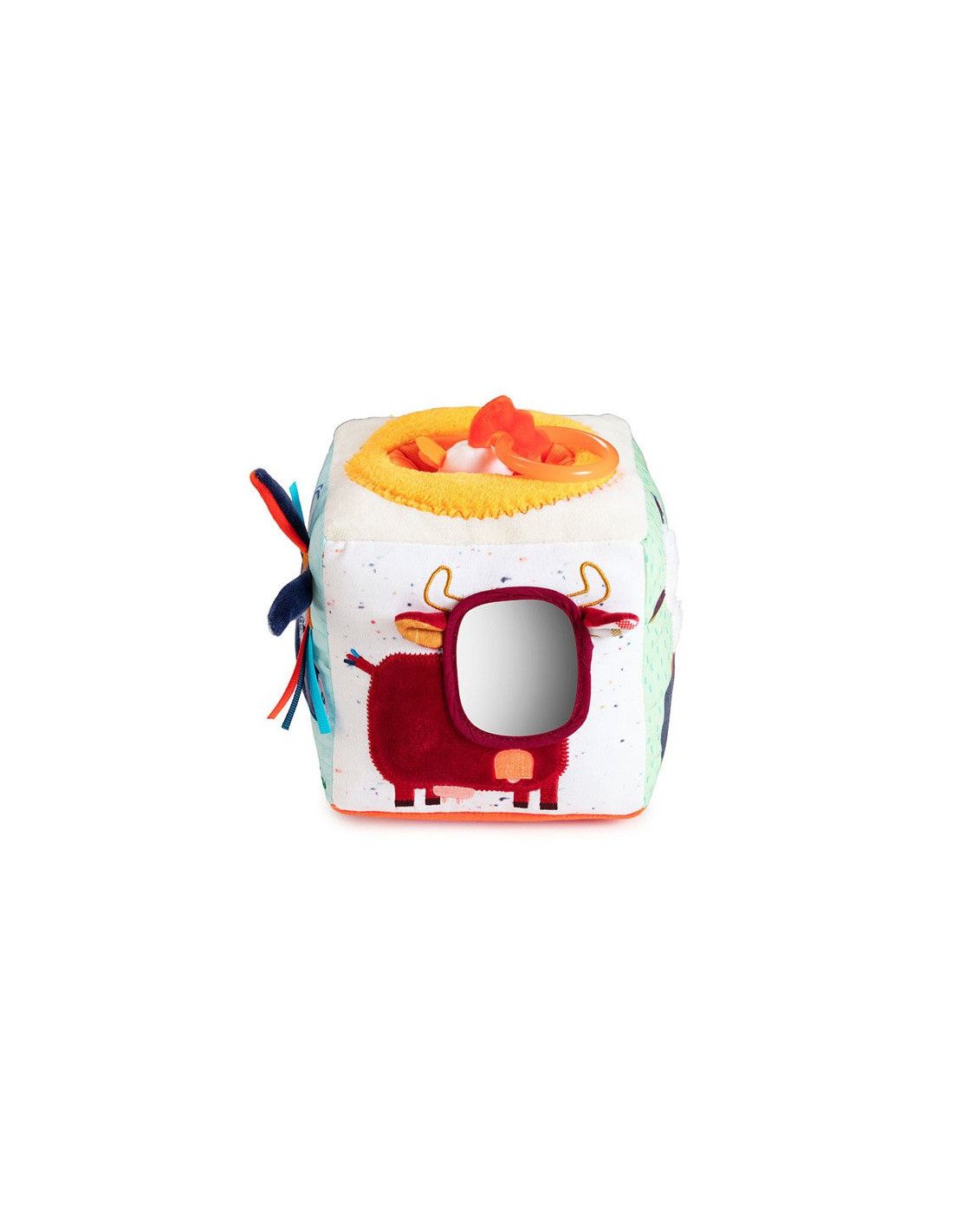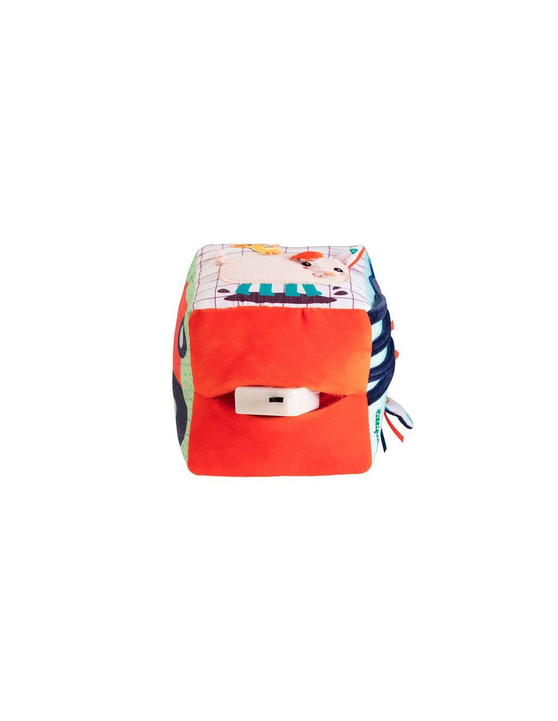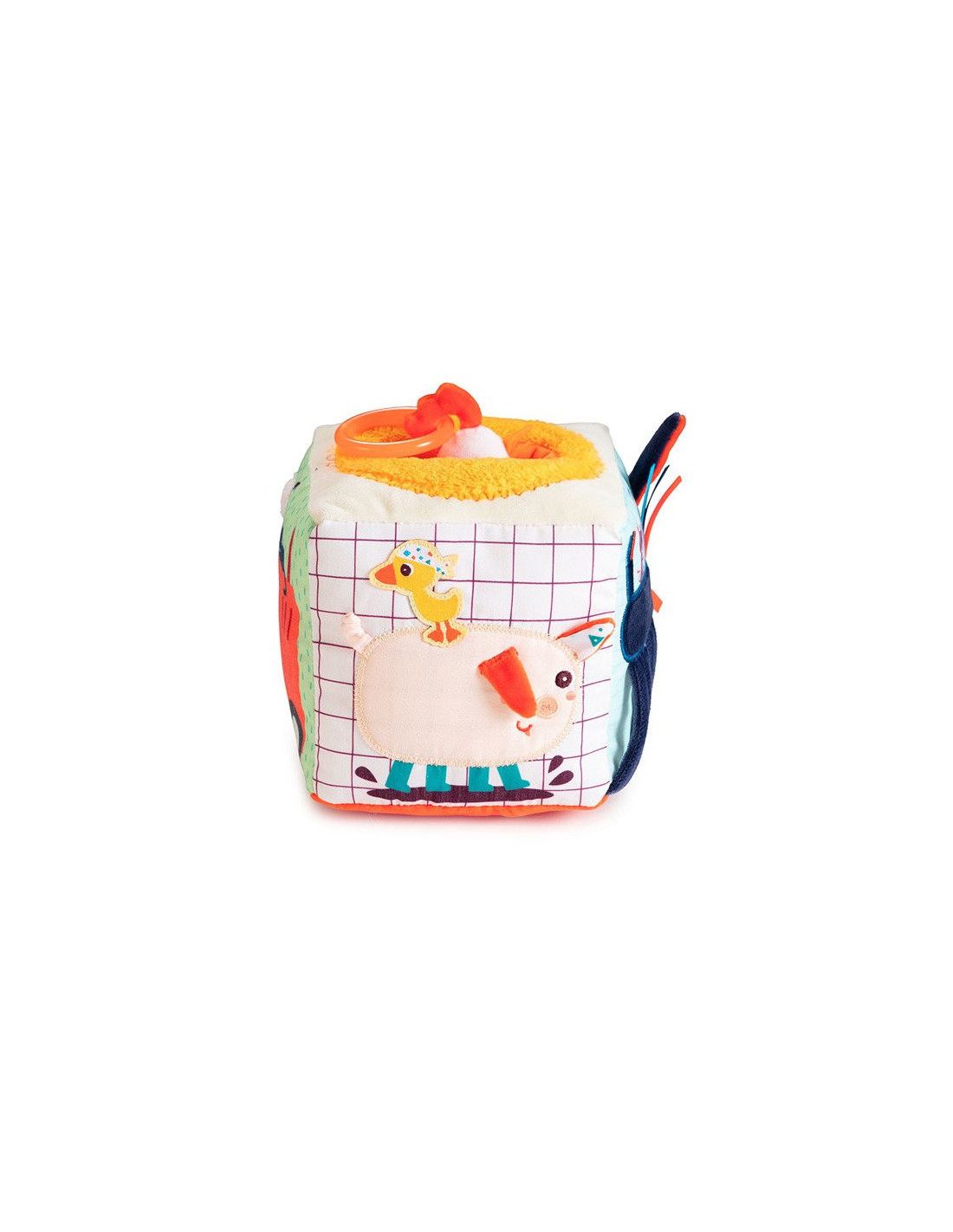 Dźwiękowa kostka aktywizująca Farma belgijskiej marki Lilliputiens to niebanalne, miękkie i wielofunkcyjne źródło rozrywki i nauki dla ciekawskich maluszków. Na każdym z jej boków znajduje się inna scenka z gospodarstwa i charakterystyczni dla marki bohaterowie: krówka Rosalie z lusterkiem, puchata owieczka Yvon kierująca traktorem, kaczor Gaston podróżujący na grzbiecie świnki Simona przez błotną kałużę, osiołek Ignace z bujną grzywą transportujący myszkę i zajączka i kokoszka Paulette chowająca się głęboko w swoim mięciutkim gnieździe. Kostka została uszyta z materiałów o różnych wzorach i fakturach, posiada wiele ukrytych funkcji, m. in. grzywa osiołka z tasiemek i aksamitne uszka zwierzątek do chwytania, obręcz-gryzak na elastycznym sznureczku, czy szeleszczący bok zabawki. Kostka przy potrząsaniu wydaje dźwięki – odgłosy różnych zwierząt hodowlanych, a zadaniem dziecka jest rozpoznać, do którego z bohaterów należy każdy z nich. Zabawka jest solidnie wykonana i w pełni bezpieczna. Zaskakuje i pobudza dziecięcą wyobraźnię. Rozwija koordynację ręka-oko i małą motorykę (chwytanie, ciągnięcie, potrząsanie, przesuwanie, wkładanie, wyciąganie), aktywizuje zmysł słuchu (odgłosy), wzroku i dotyku, a obręcz-gryzak – przynosi ulgę w trudnym okresie ząbkowania.