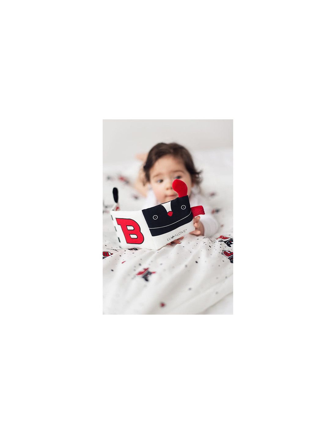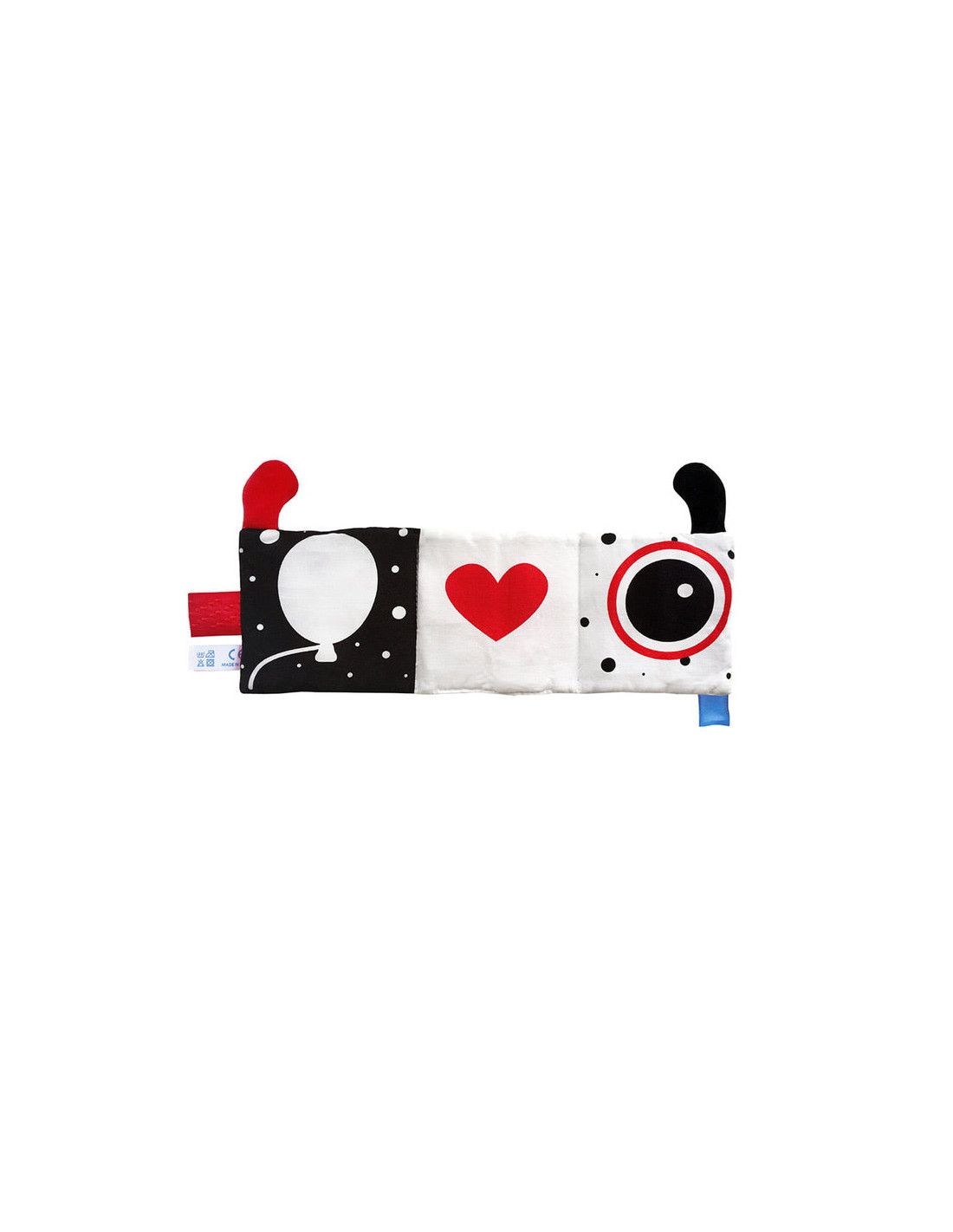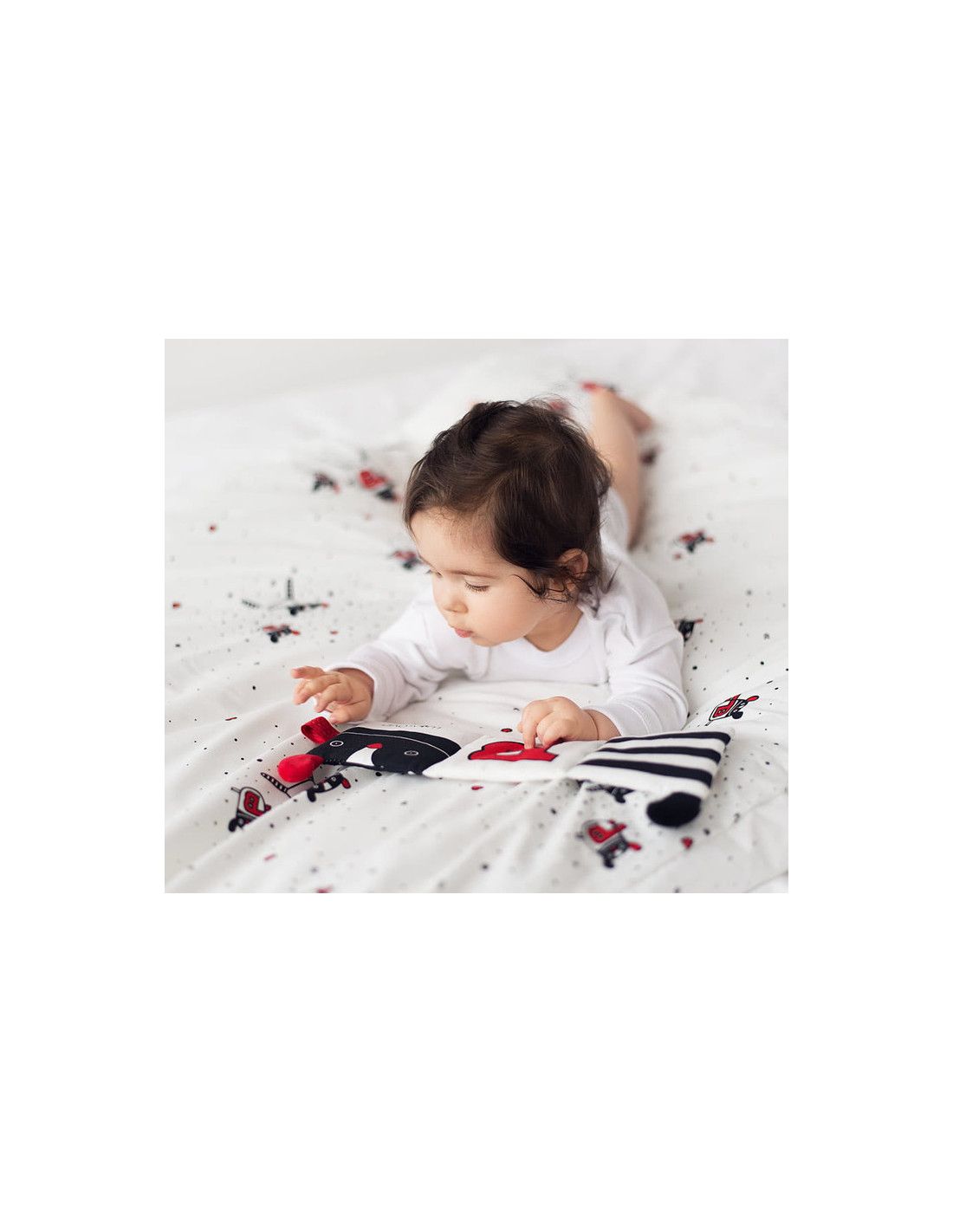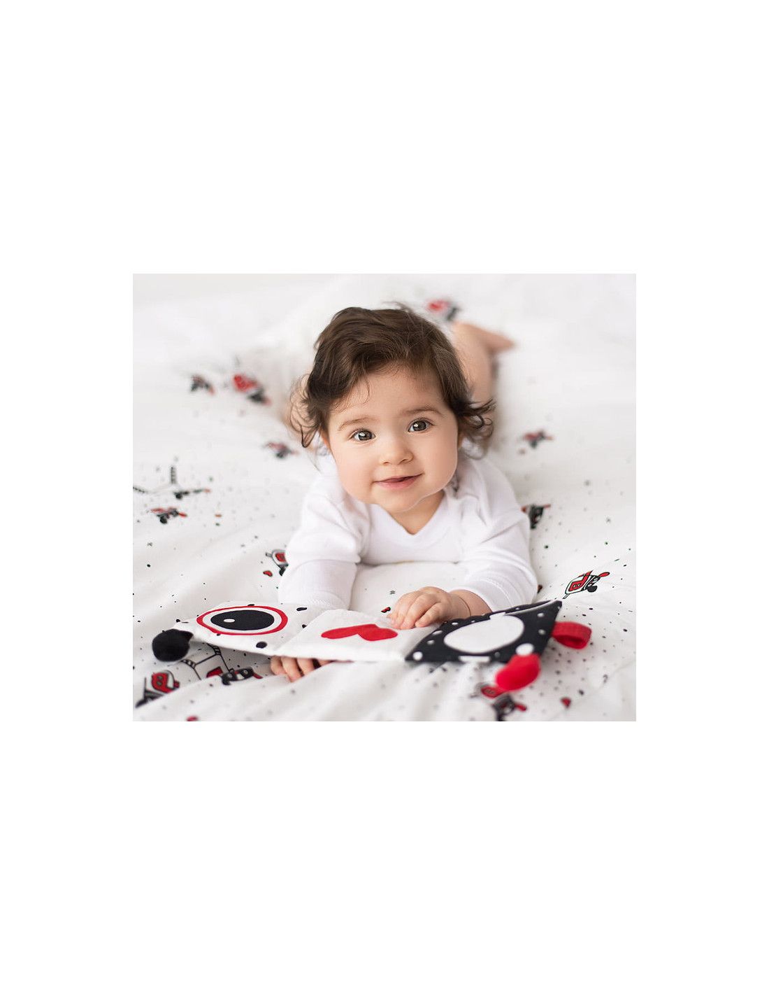 Kontrastowa książeczka dla najmłodszych dzieci wykonana z 100% bawełny. Szczególnie polecana niemowlętom w pierwszym półroczu życia. Malutka, poręczna, łatwa do prania, idealnie sprawdzi się podczas pierwszych zabaw z dzieckiem. Specjalnie zaprojektowane wzory, waga oraz długość książeczki, odpowiadają możliwością motorycznych i potrzebom rozwojowym niemowląt.