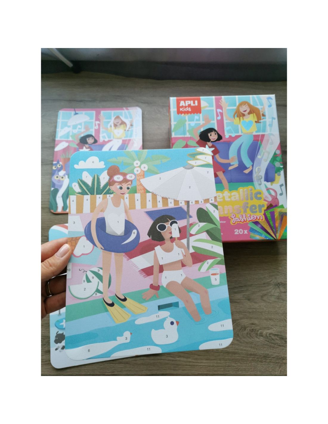 Zestaw artystyczny Apli Kids z metalicznymi kartkami spodoba się każdej małej artystce. Przy okazji świetnej zabawy, dzieci ćwiczą precyzję i cierpliwość. W zestawie znajdziemy 4 arkusze do ozdabiania oraz 20 metalizowanych kartek. Za pomocą dołączonej łopatki dziecko odkleja ponumerowaną część rysunku, która pod spodem pokryta jest klejem, przykłada metaliczny arkusz do obrazka i dociska dołączoną do zestawu łopatką. Dzięki tej technice możemy cieszyć się pięknie ozdobionym obrazkiem a po zabawie powiesić go np. na ścianie. Zestaw idealnie nadaje się na prezent.
