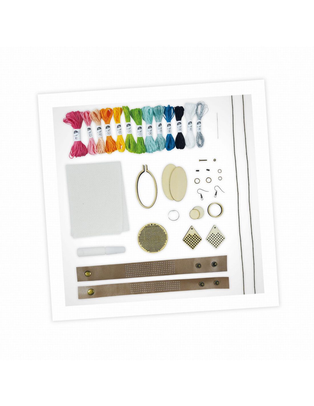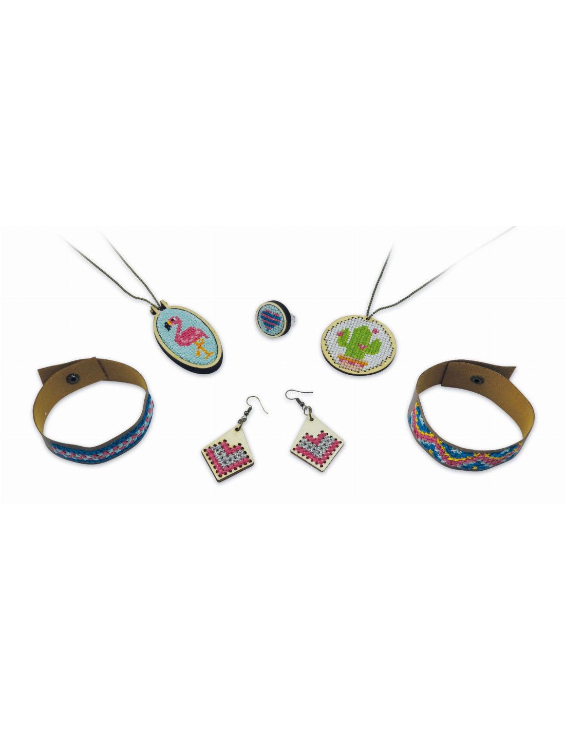 Zestaw do stworzenia 6 różnych elementów biżuterii - wisiorków, kolczyków, bransoletek i pierścionka przy użyciu techniki haftu krzyżykowego.