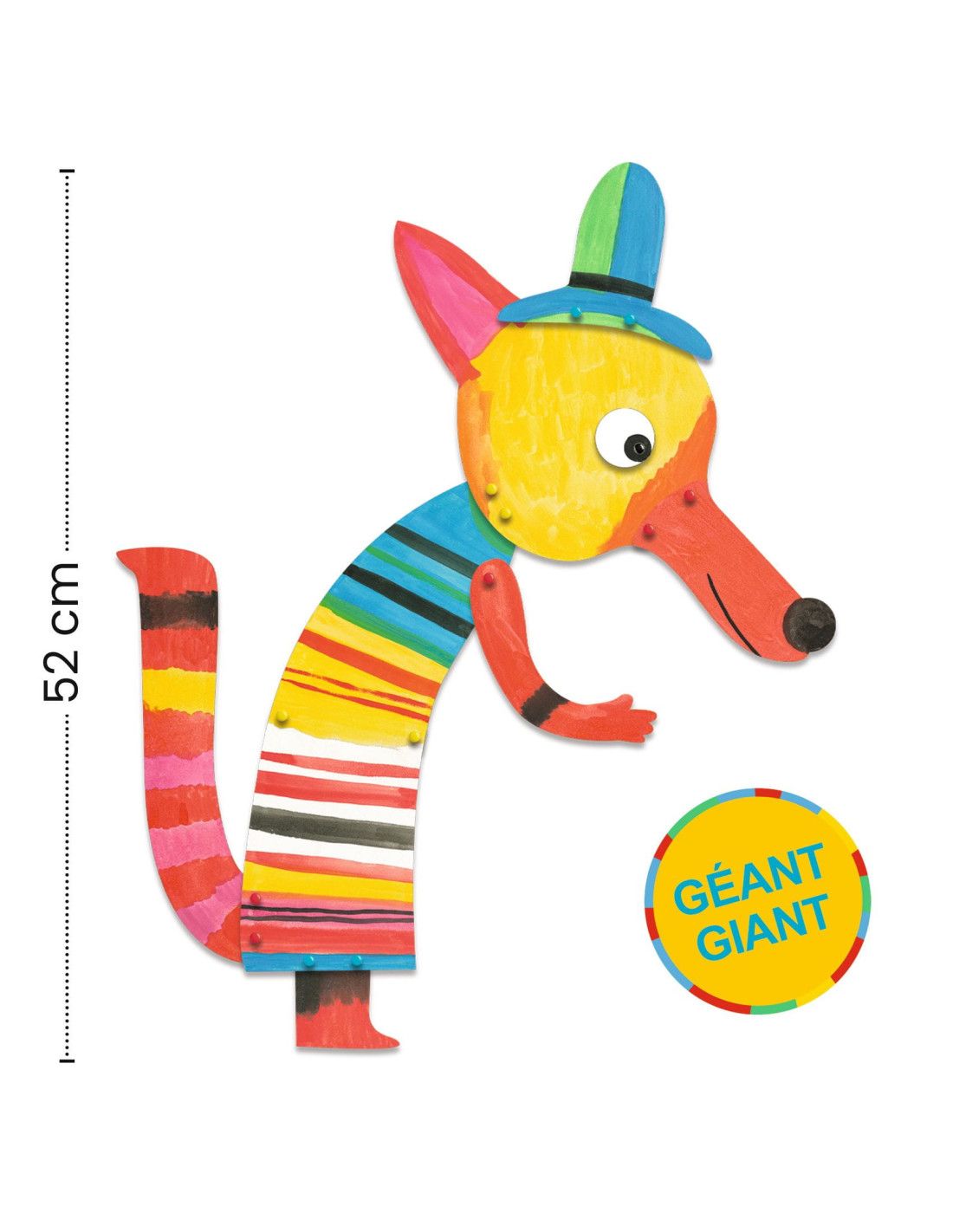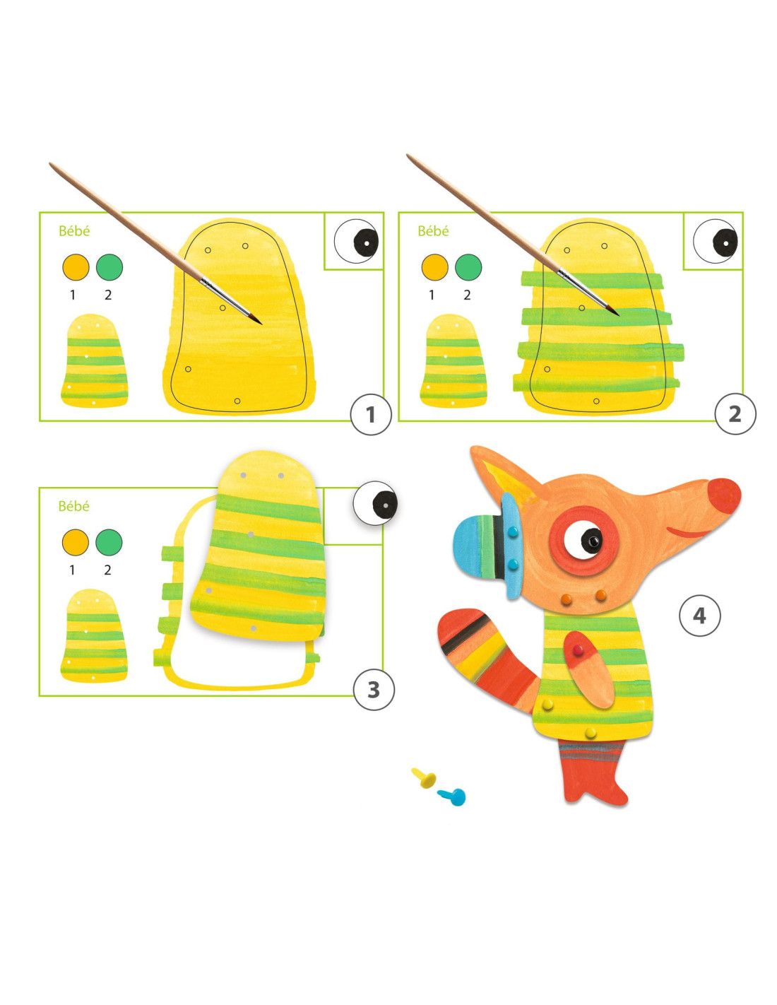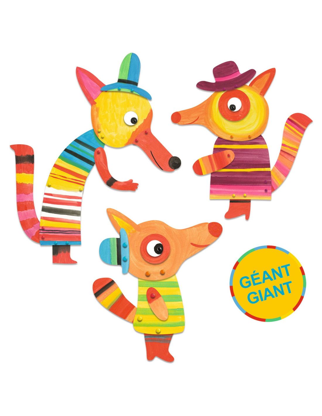 Trzy duże postacie do pokolorowania i połączenia bezpiecznymi pineskami. Dziecko maluje pędzlem wszystkie elementy, według załączonej instrukcji obrazkowej. Po wyschnięciu elementów, łączy je pineskami, aby stworzyć: tatę lisa (50 cm), mamę (40 cm) i dziecko (28 cm).