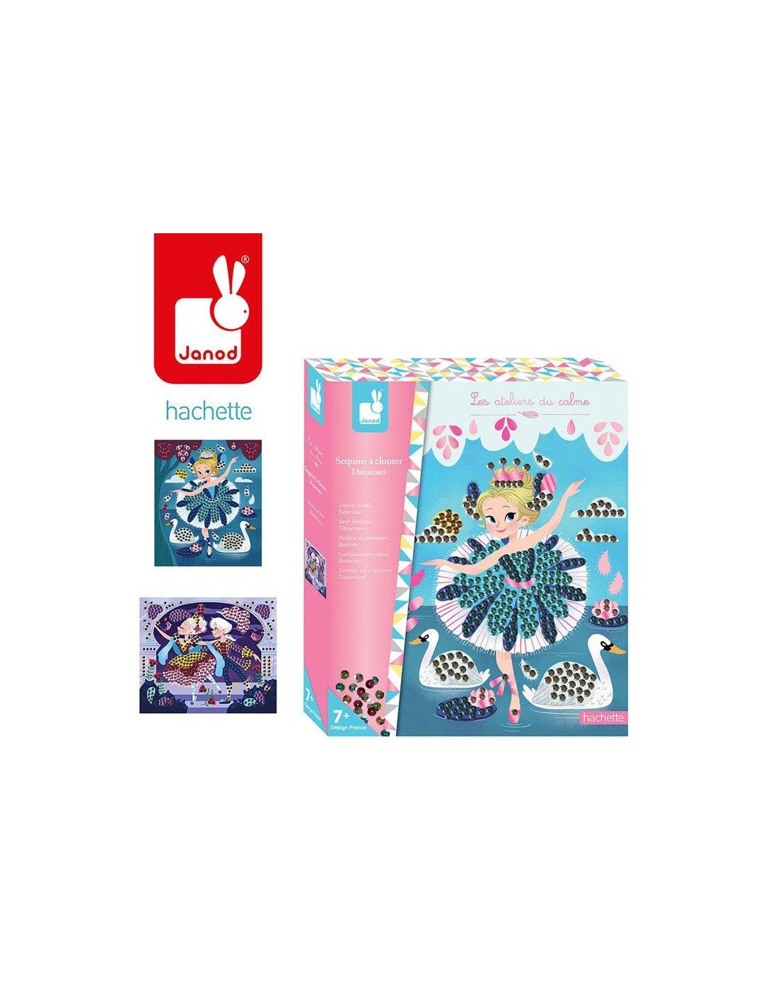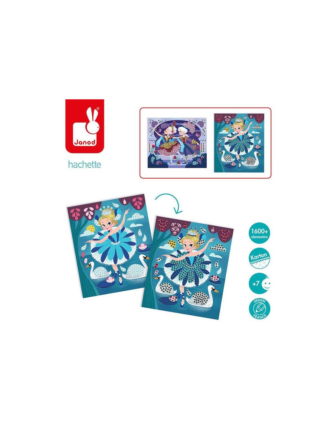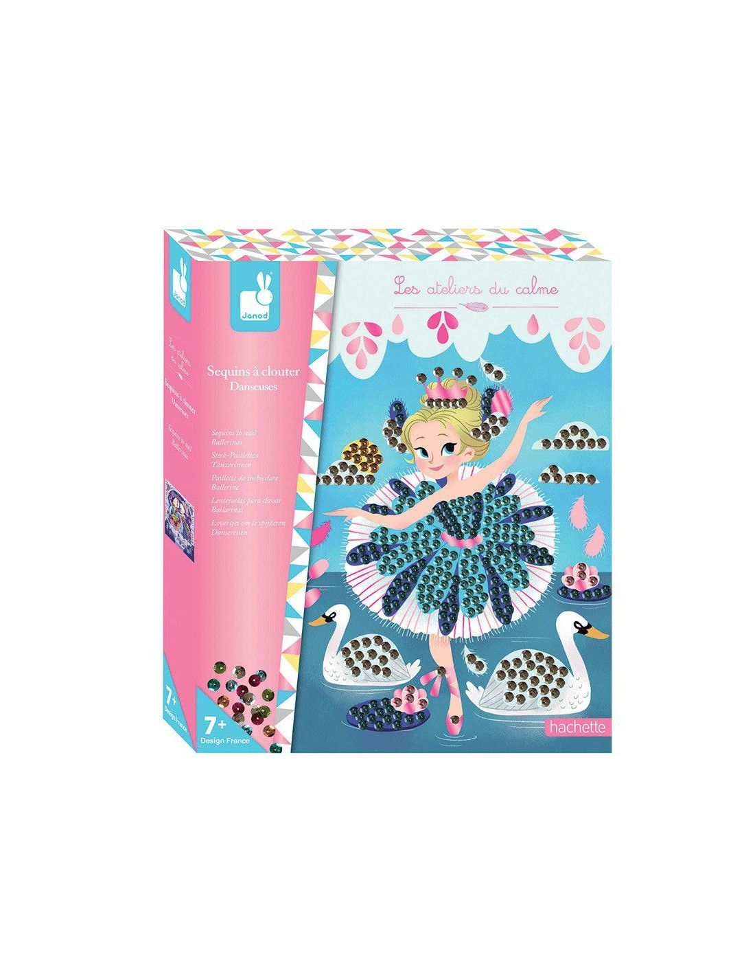 Zestaw kreatywny Urokliwe cekiny Baletnice francuskiej marki JANOD zawiera 2 kartonowe obrazki podklejone pianką, przedstawiające baletnice podczas występów na scenie. Ilustracje te można ozdobić, wpinając w nie – zarówno w sugerowanych miejscach, jak i dowolnie – dołączone do zestawu cekiny. Jest ich aż 800 w 7 różnych kolorach. Do zestawu są również dołączone mini-szpileczki do mocowania cekinów. Przypinanie cekinów to dla dziecka długie godziny angażującej i jednocześnie uspokajającej, wyciszającej zabawy, a gotowe obrazki staną się wspaniałym elementem dekoracyjnym dziecięcego pokoju.