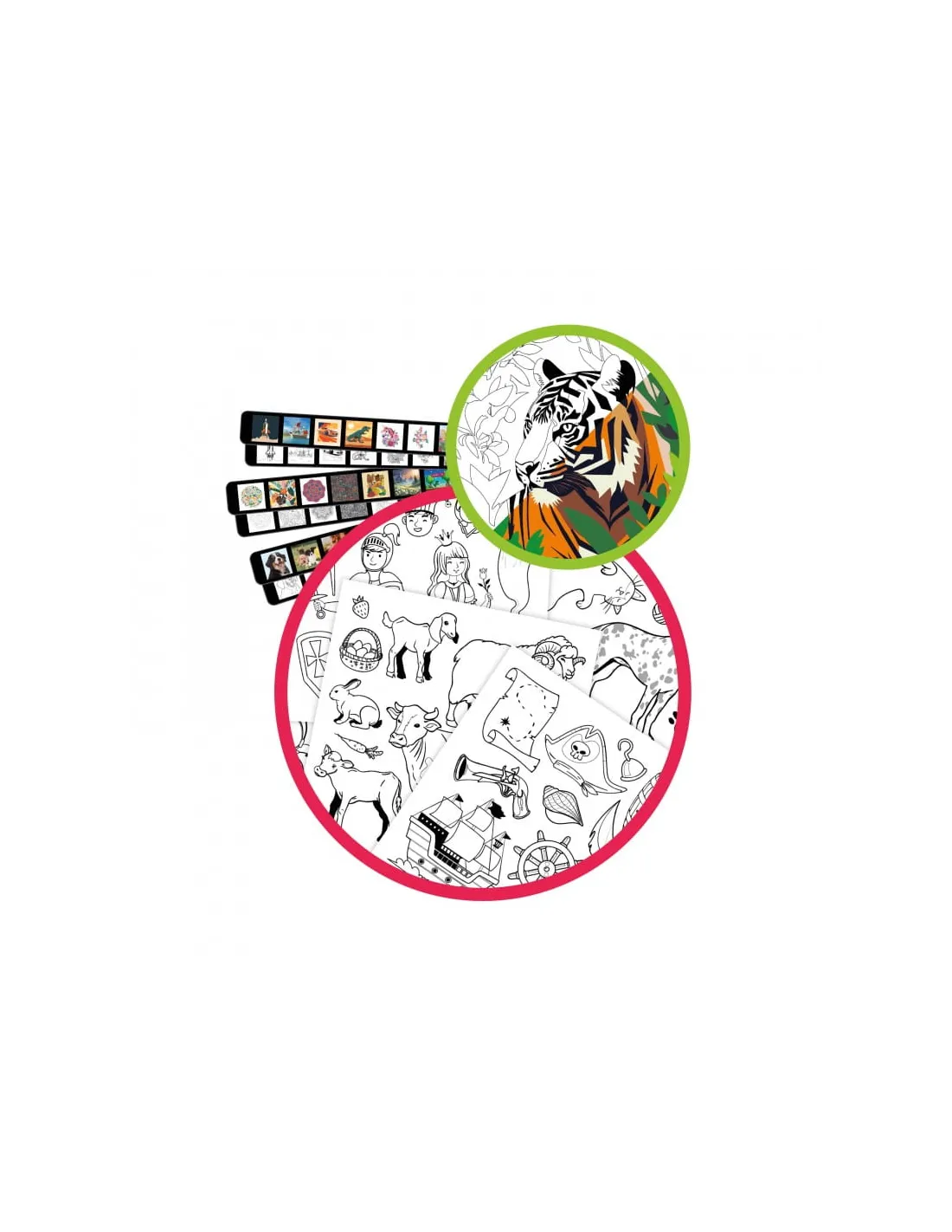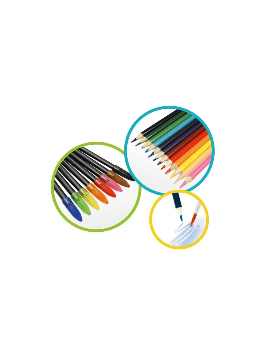Zawiera komplet akcesoriów do rysowania – kredki, markery, ołówek, temperówkę i więcej