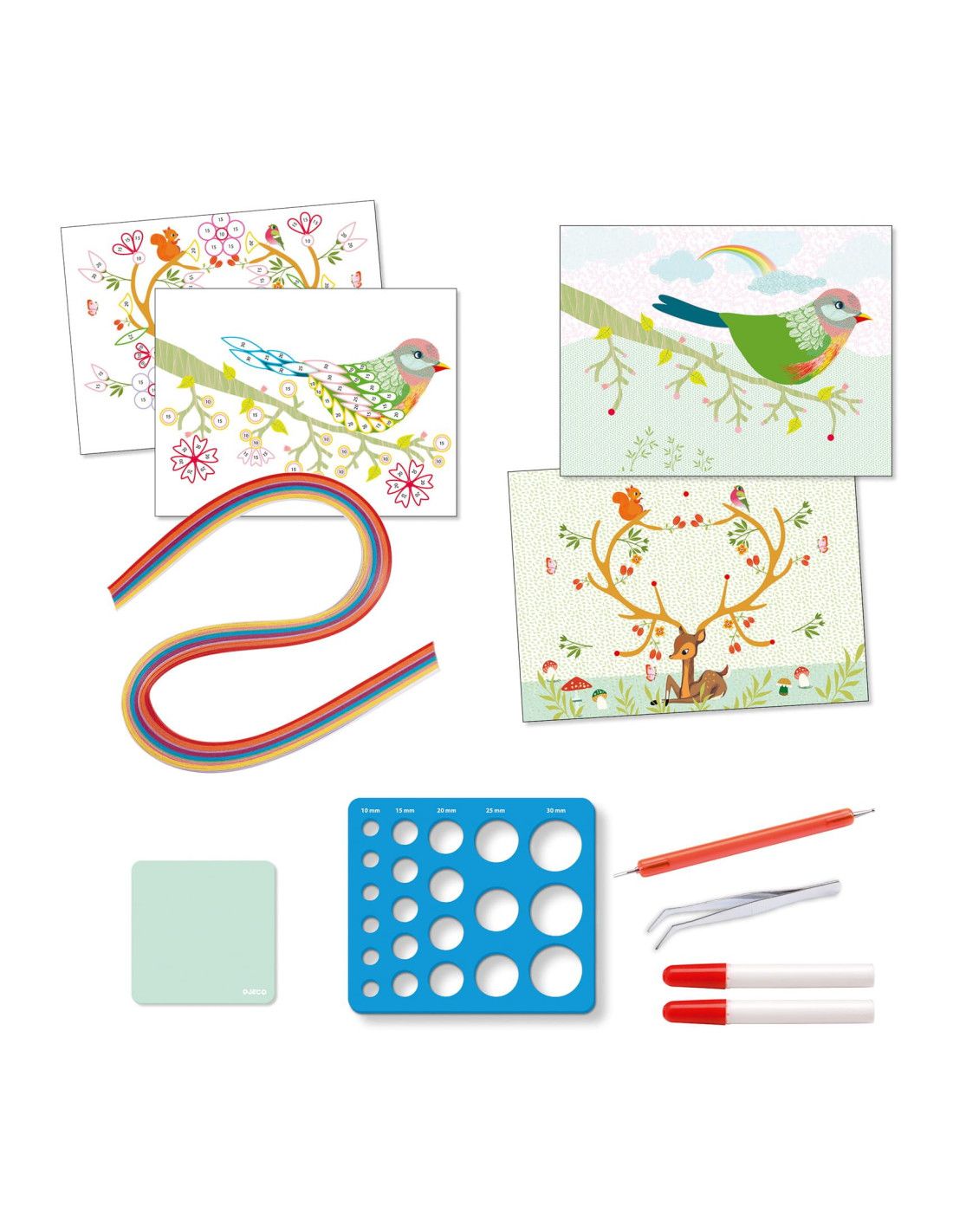 Zestaw Artystyczny PORY ROKU Quilling marki Djeco to idealny sposób na stworzenie własnych, magicznych obrazków z papierowych spiral. Dzięki tej kreatywnej technice Quilling, dzieci mogą przekształcić kolorowe paski papieru w zachwycające ptaki, kwiaty i inne detale, tworząc wspaniałe dzieła sztuki.