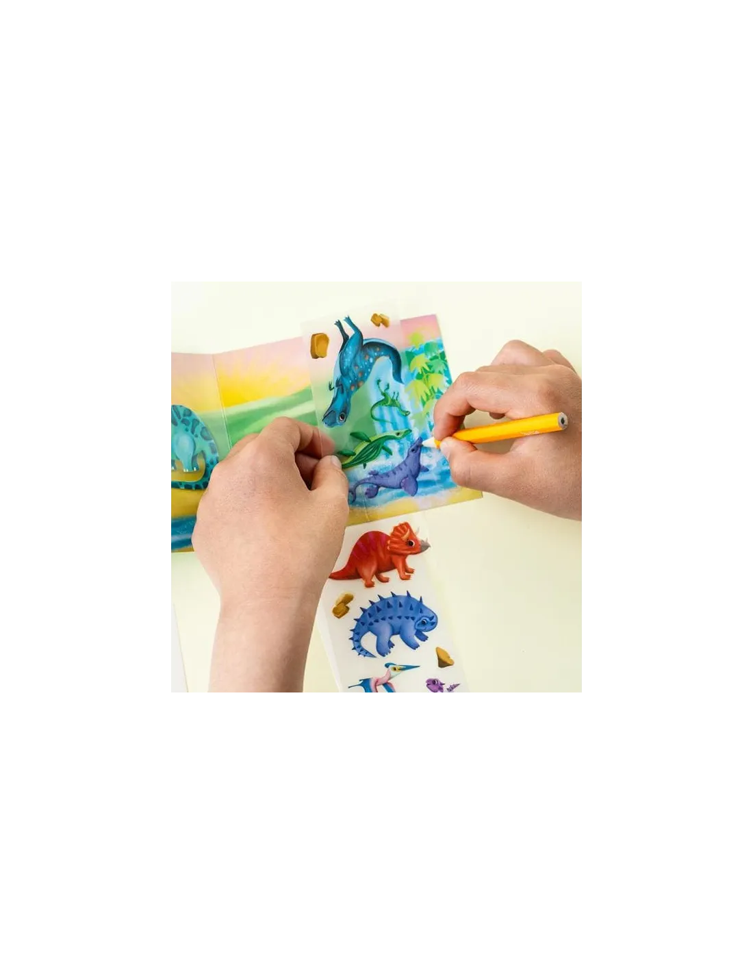 Zabawa jest niezwykle prosta – wybierz arkusz kalkomanii, zdejmij papier podkładowy, przyłóż wybrany element do szablonu i potrzyj dołączonym ołówkiem. W kilka chwil kolorowa naklejka przeniesie się na planszę, tworząc barwną, prehistoryczną scenę. To kreatywna zabawa, która rozwija motorykę małą, koncentrację oraz koordynację ręka–oko, zapewniając jednocześnie mnóstwo radości.