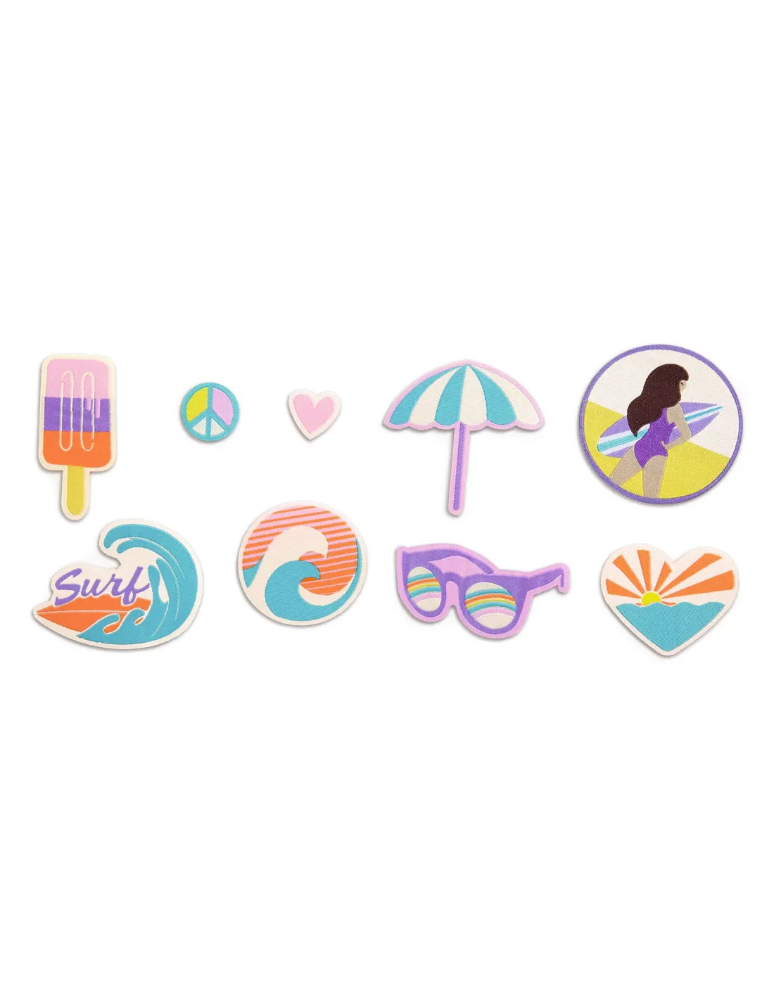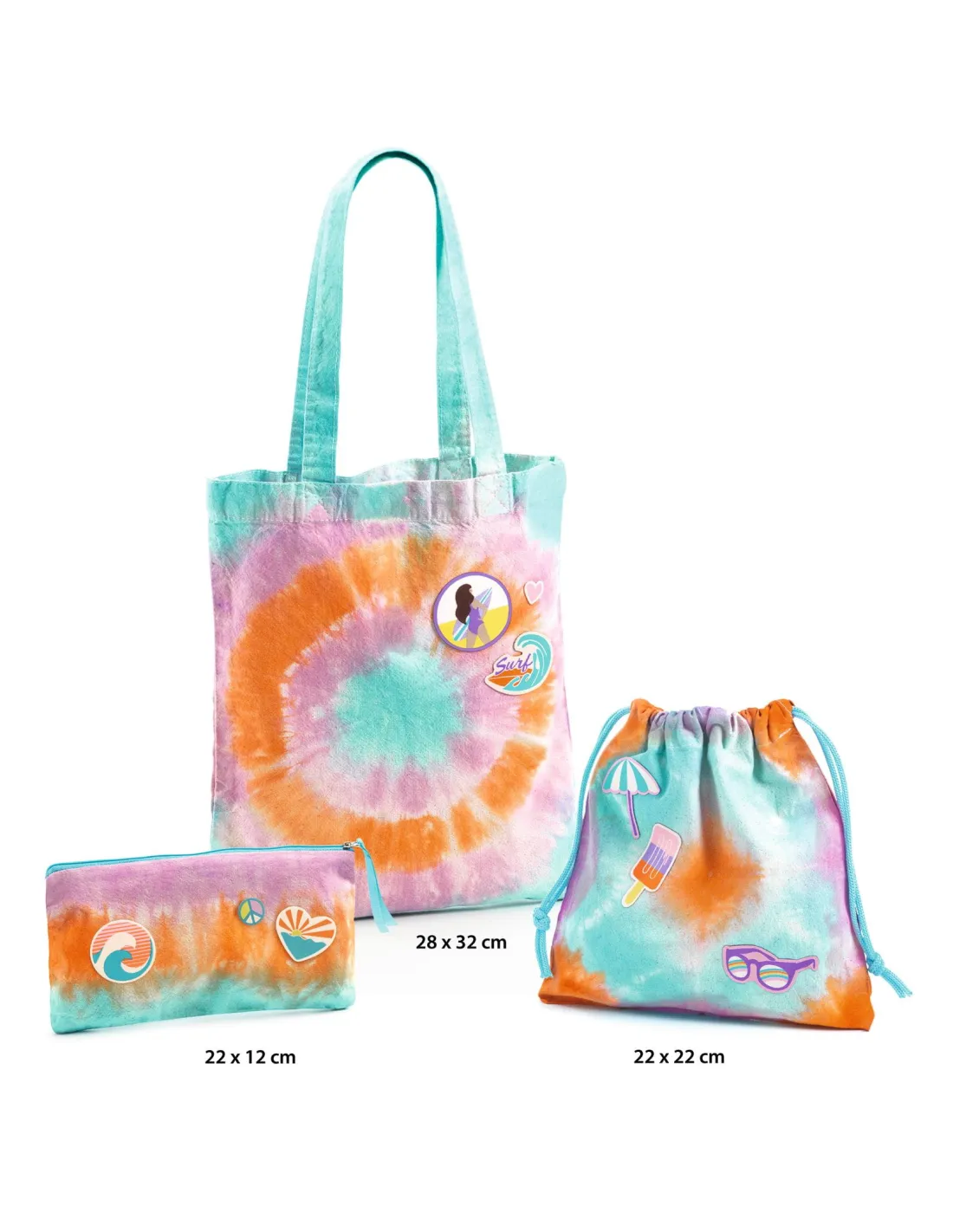 W zestawie znajdują się bawełniana torba, worek-plecak oraz saszetka na zamek, które można ozdobić na wiele sposobów. Farbowanie może przyjąć formę geometrycznych linii, kół czy nieregularnych kształtów, dzięki czemu każdy projekt staje się unikatowy. Po wysuszeniu akcesoria można dodatkowo udekorować prasowankami w wakacyjne wzory, co pozwala na personalizację i stworzenie wyjątkowych dodatków.