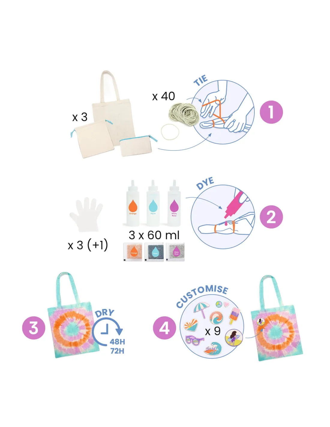 Zestaw kreatywny Djeco Tie-Dye Zrób to Sam to idealna propozycja dla dzieci i młodzieży, które chcą tworzyć własne, niepowtarzalne akcesoria modowe. Metoda tie-dye (zawiąż i pofarbuj) polega na związaniu materiału gumkami recepturkami, a następnie farbowaniu i suszeniu tkaniny, co pozwala uzyskać efekt kolorowych, nieregularnych wzorów z subtelnymi przejściami i cieniowaniem.