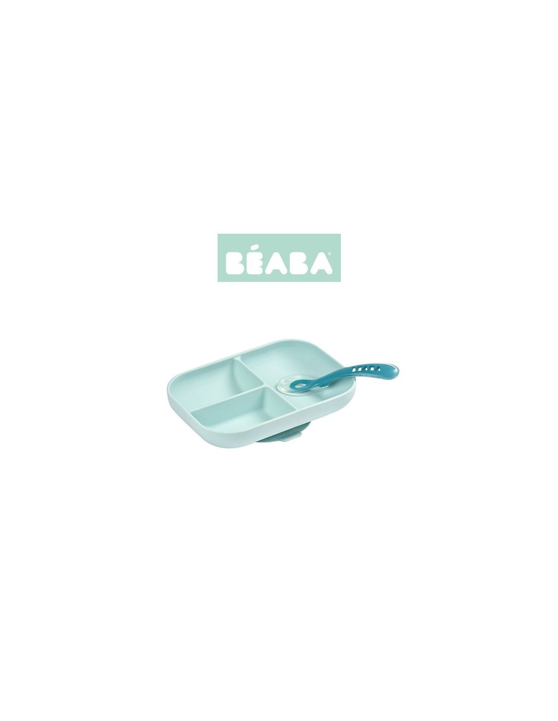 Komplet naczyń z silikonu francuskiej marki BEABA składa się ze sporego trójdzielnego talerzyka-miseczki i łyżeczki treningowej. Wszystkie elementy zestawu charakteryzuje ergonomiczny, zaokrąglony kształt i miękkie, gładkie brzegi. Podział talerza na trzy przestrzenie (150 ml + 90 ml + 90 ml) pozwala podzielić posiłek na porcje, co ułatwi malcowi naukę samodzielnego jedzenia, oraz właściwe komponowanie posiłków. Wyższe boki pomagają dziecku samodzielnie nabierać jedzenie. Naczynie ma na spodzie antypoślizgową przyssawkę, dzięki czemu jest stabilne i dobrze trzyma się stołu. Łyżeczka idealnie dopasowuje się do dziecięcej buzi i można ją odłożyć tak, by główka nie dotykała powierzchni, dzięki czemu jej używanie jest o wiele bardziej higieniczne.