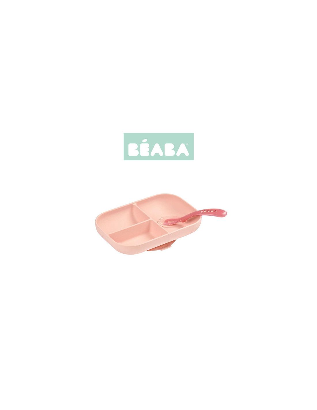Komplet naczyń z silikonu francuskiej marki BEABA składa się ze sporego trójdzielnego talerzyka-miseczki i łyżeczki treningowej. Wszystkie elementy zestawu charakteryzuje ergonomiczny, zaokrąglony kształt i miękkie, gładkie brzegi. Podział talerza na trzy przestrzenie (150 ml + 90 ml + 90 ml) pozwala podzielić posiłek na porcje, co ułatwi malcowi naukę samodzielnego jedzenia, oraz właściwe komponowanie posiłków. Wyższe boki pomagają dziecku samodzielnie nabierać jedzenie. Naczynie ma na spodzie antypoślizgową przyssawkę, dzięki czemu jest stabilne i dobrze trzyma się stołu. Łyżeczka idealnie dopasowuje się do dziecięcej buzi i można ją odłożyć tak, by główka nie dotykała powierzchni, dzięki czemu jej używanie jest o wiele bardziej higieniczne.
