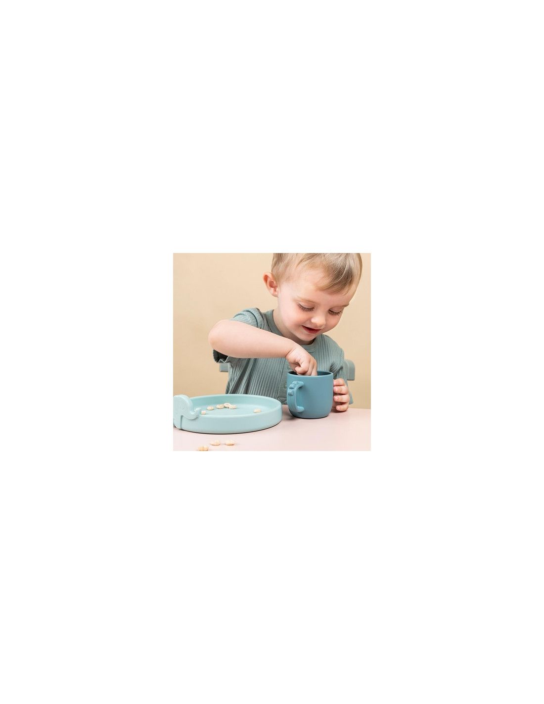 Uroczy talerz, widelec i kubek z dwoma uchwytami wykonane są z silikonu spożywczego. Dzięki czemu, naczynia dla dziecka z serii Peekaboo są nietłukące. Silikon dodaje także funkcje antypoślizgowe/łatwość chwytania i sprawia, że talerz oraz kubek Peekaboo nadają się do użytku w kuchence mikrofalowej.
